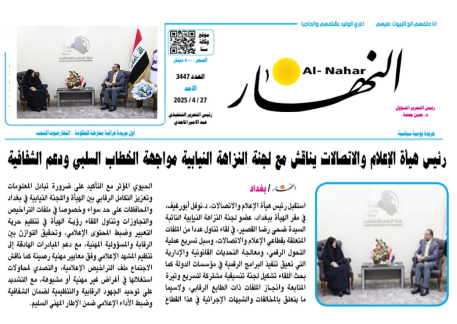 صحيفة النهار .. رئيس هيأة الاعلام والاتصالات يناقش مع لجنة النزاهة النيابية مواجهة الخطاب السلبي