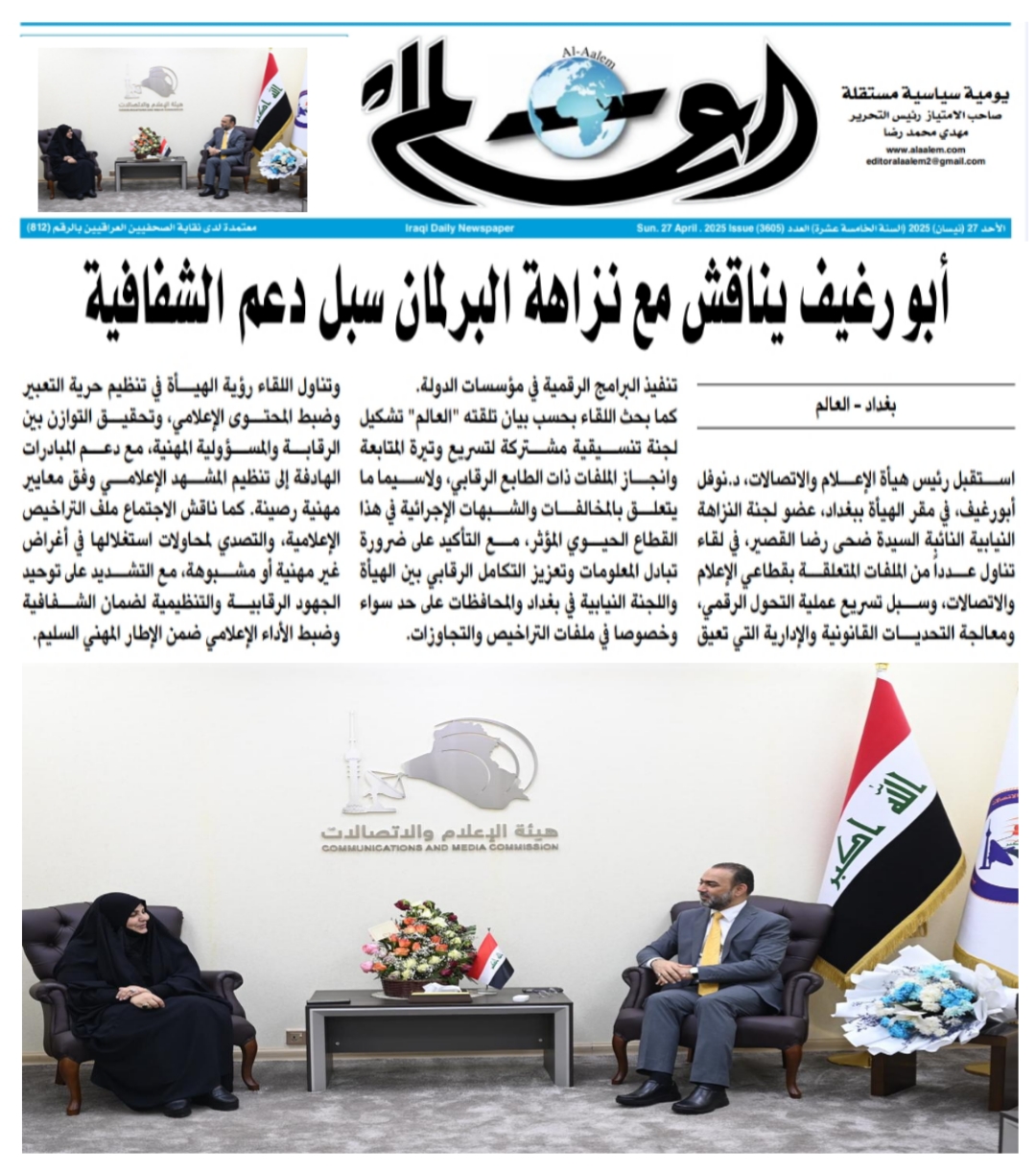 صحيفة العالم .. ابورغيف يناقش مع نزاهة البرلمان سبل دعم الشفافية