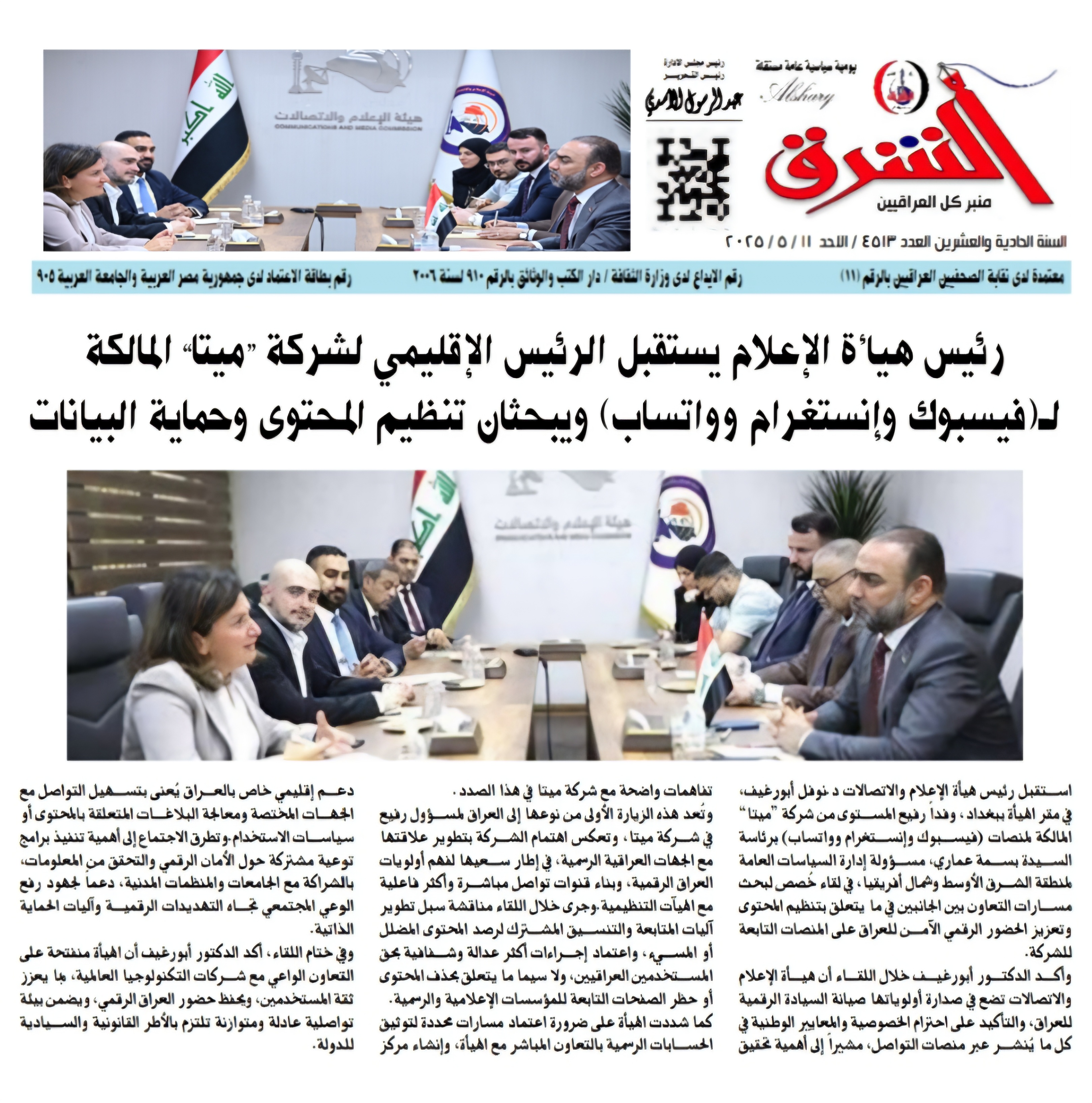 صحيفة الشرق .. رئيس هيأة الاعلام والاتصالات يستقبل وفد شركة (ميتا)