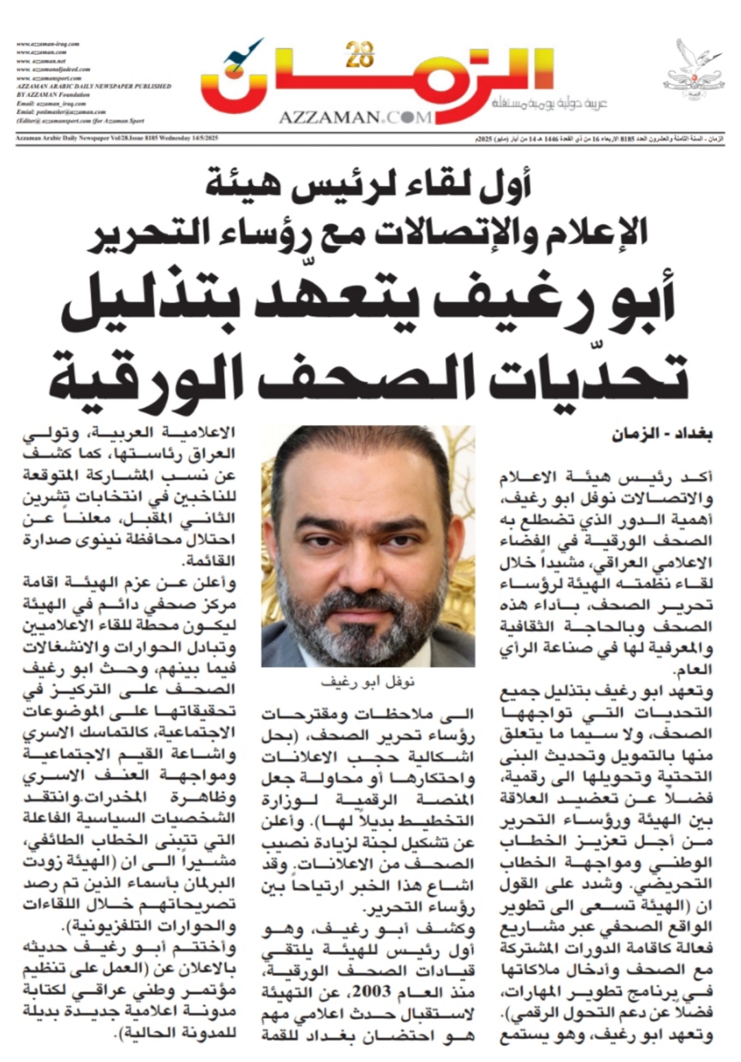 صحيفة الزمان .. اول لقاء لرئيس هيأة الاعلام والاتصالات مع رؤساء تحرير الصحف