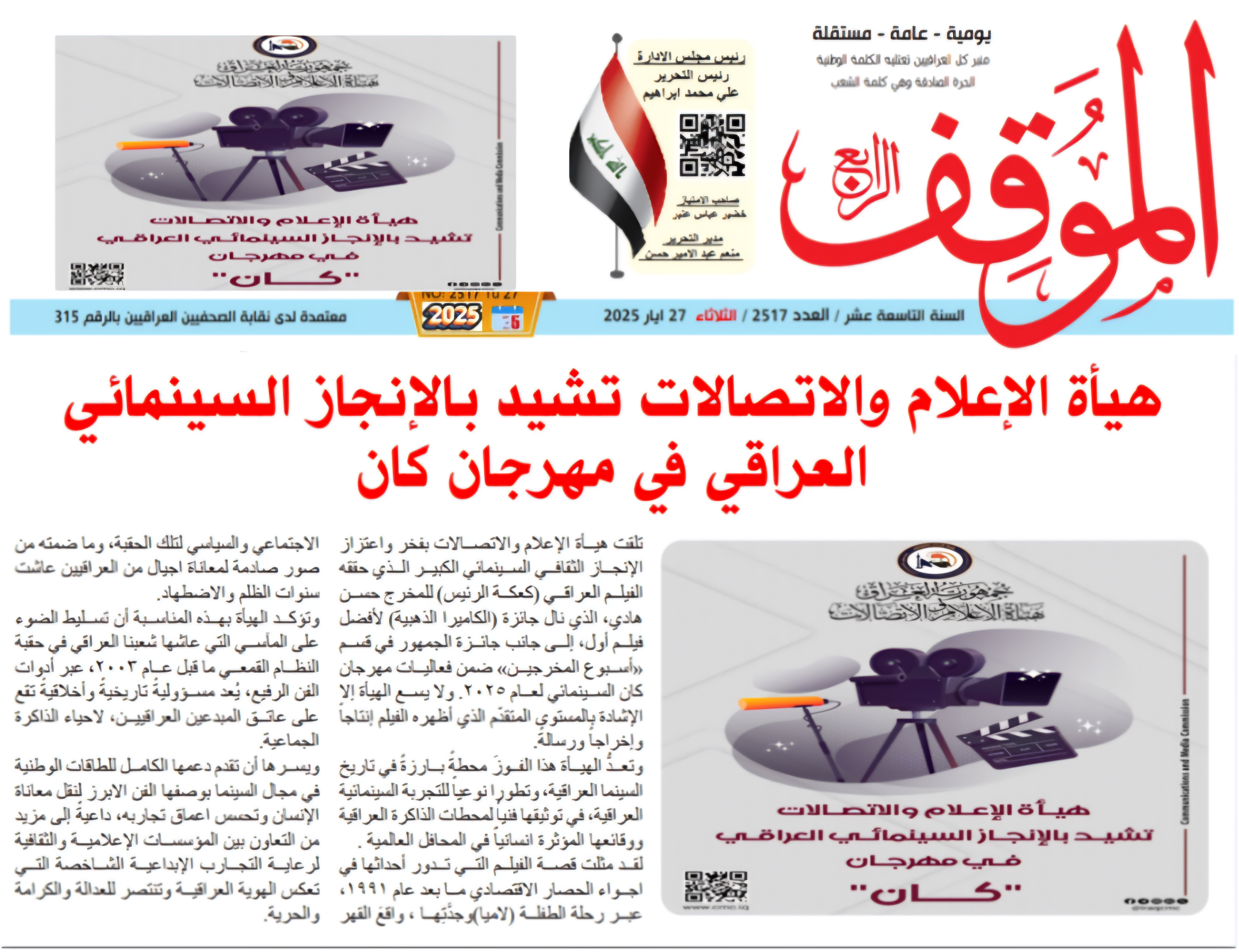 صحيفة الموقف .. هيأة الاعلام والاتصالات تشيد بالانجاز السينمائي العراقي في مهرجان كان