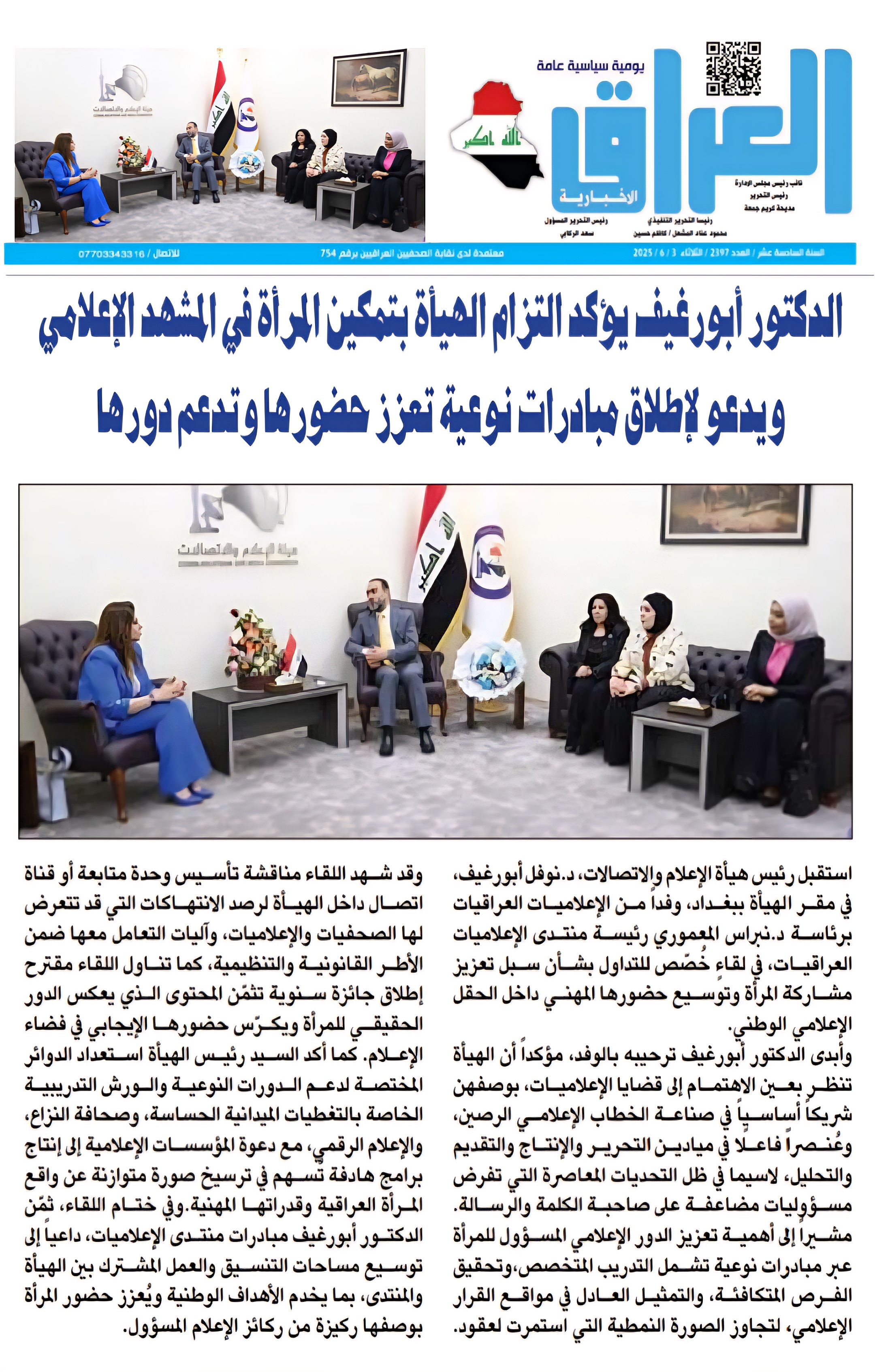 صحيفة العراق الاخبارية .. ابورغيف يؤكد التزام الهيأة بتمكين المرأة في المشهد الاعلامي