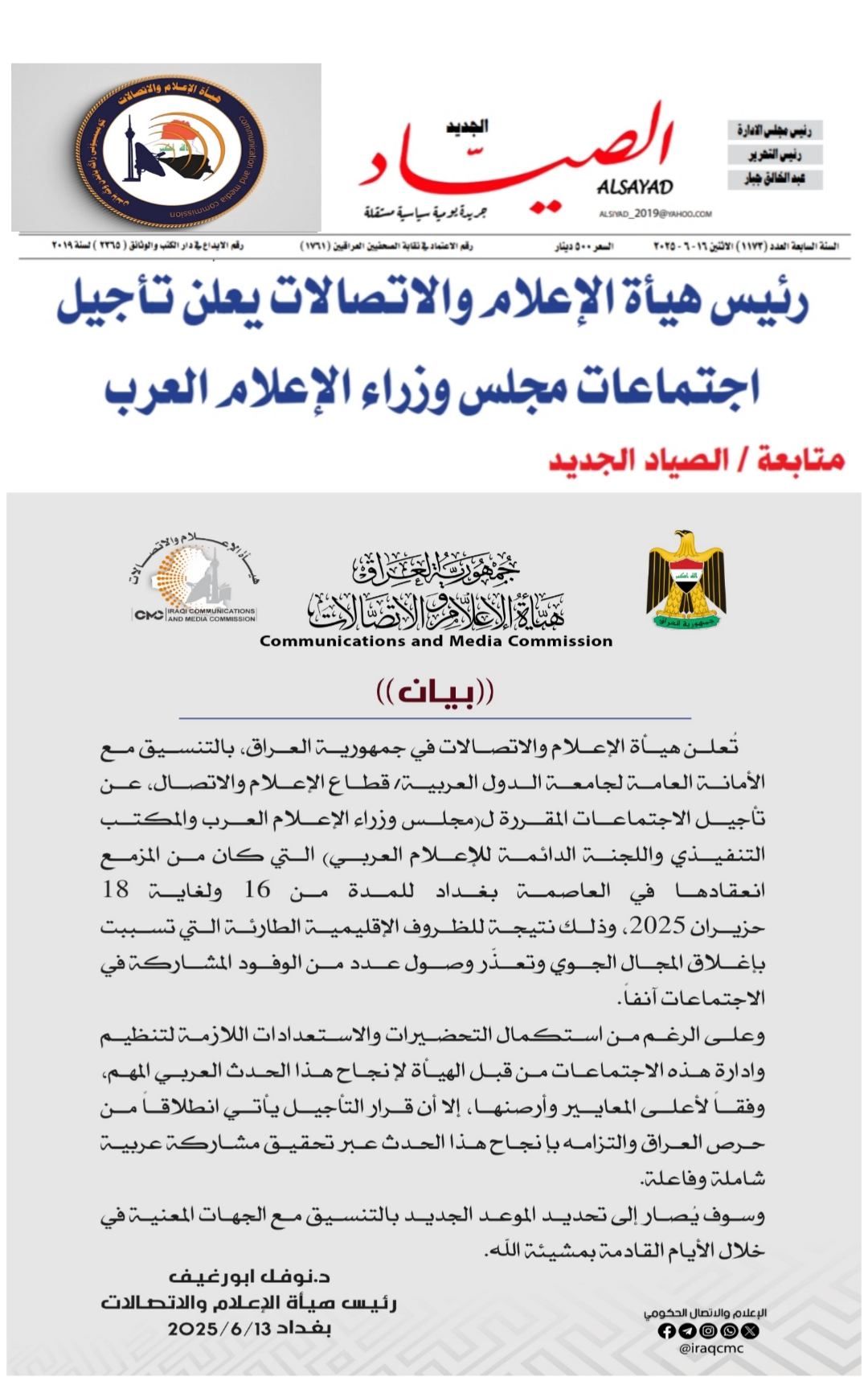 صحيفة الصياد .. رئيس هيأة الاعلام والاتصالات يعلن تأجيل اجتماعات مجلس وزراء الاعلام العرب