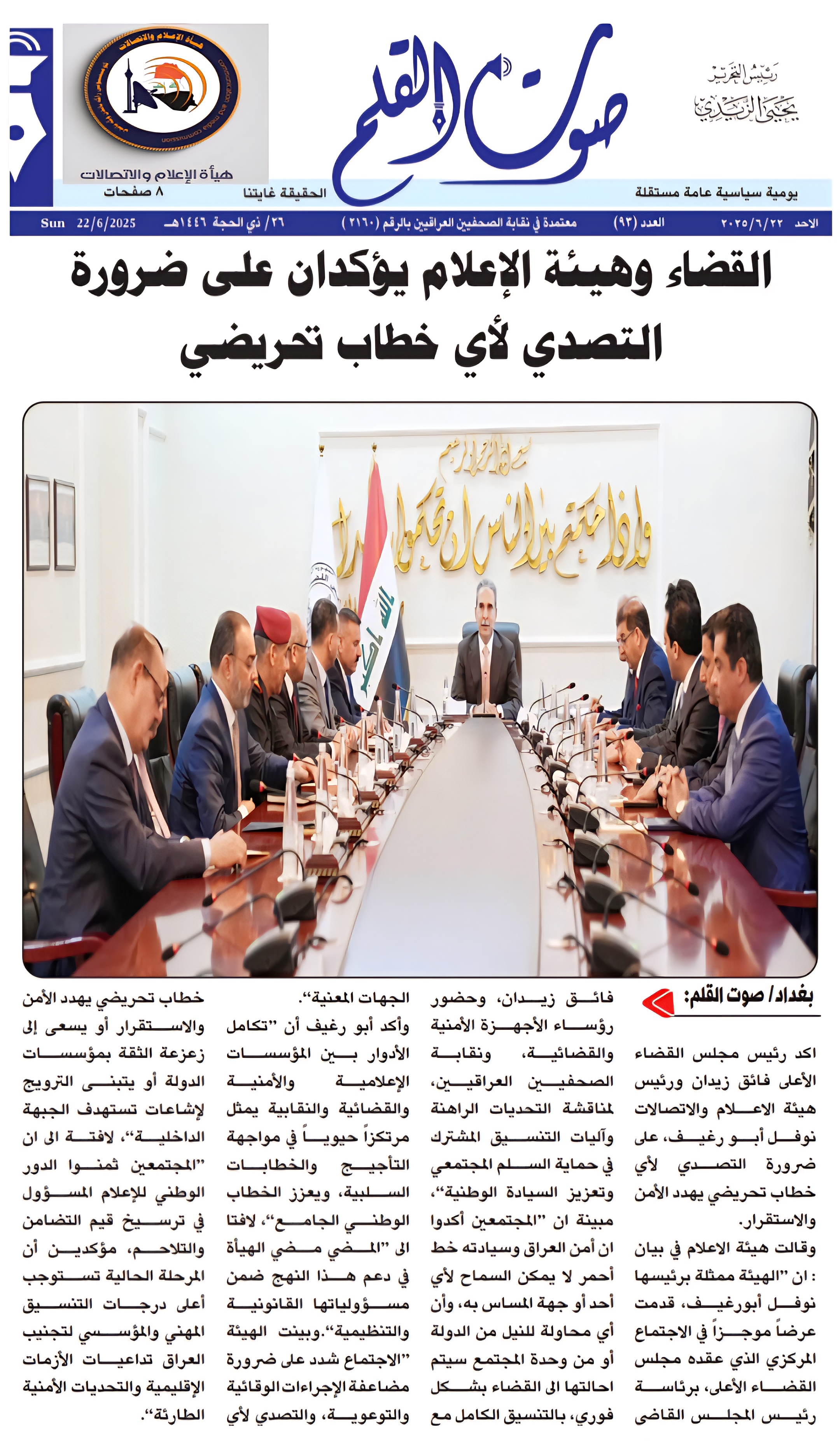 صحيفة صوت القلم .. القضاء وهيأة الاعلام يؤكدان على ضرورة التصدي لأي خطاب تحريضي
