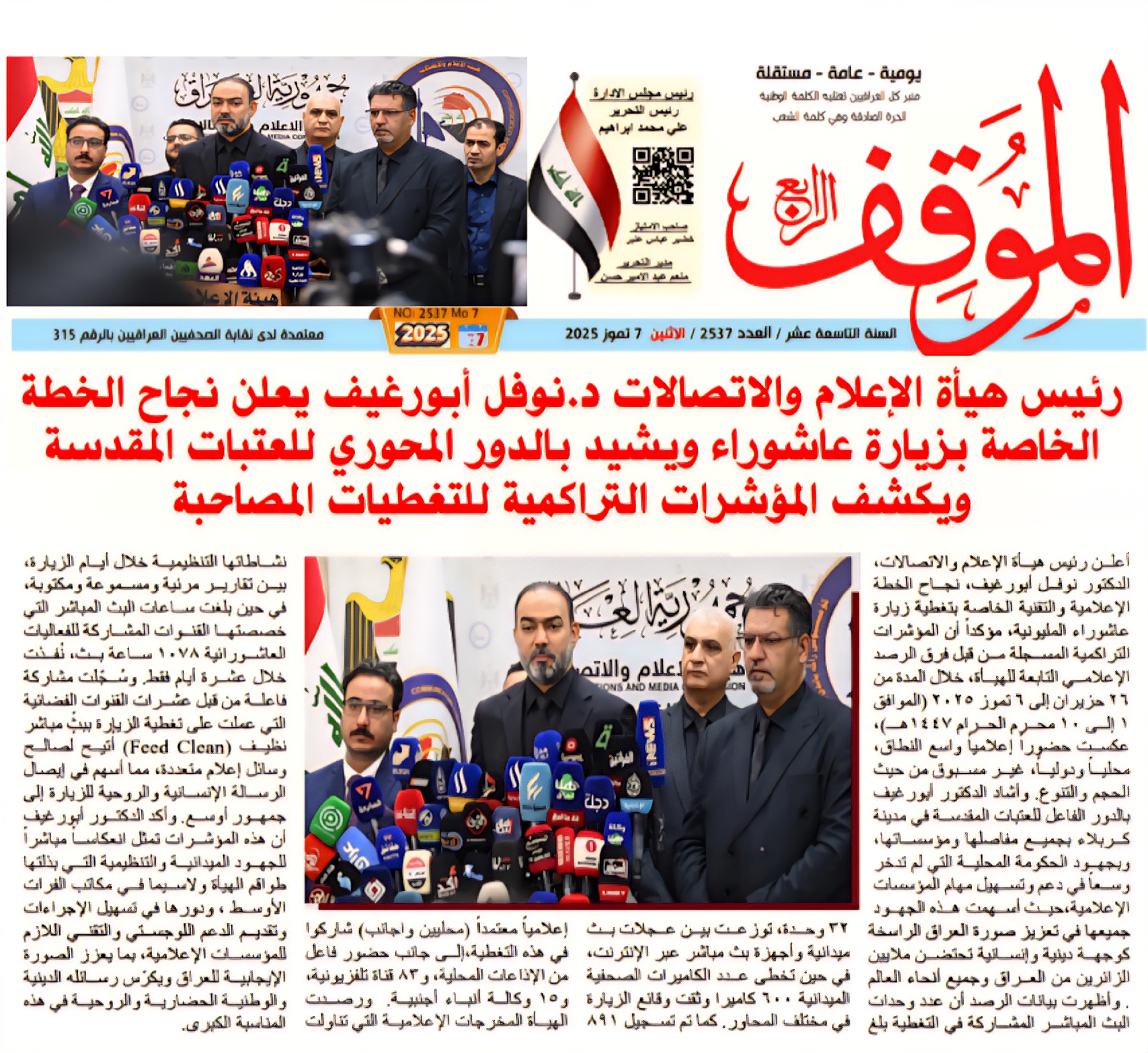 صحيفة الموقف .. رئيس هيأة الاعلام والاتصالات يعلن نجاح الخطة الخاصة بزيارة عاشوراء