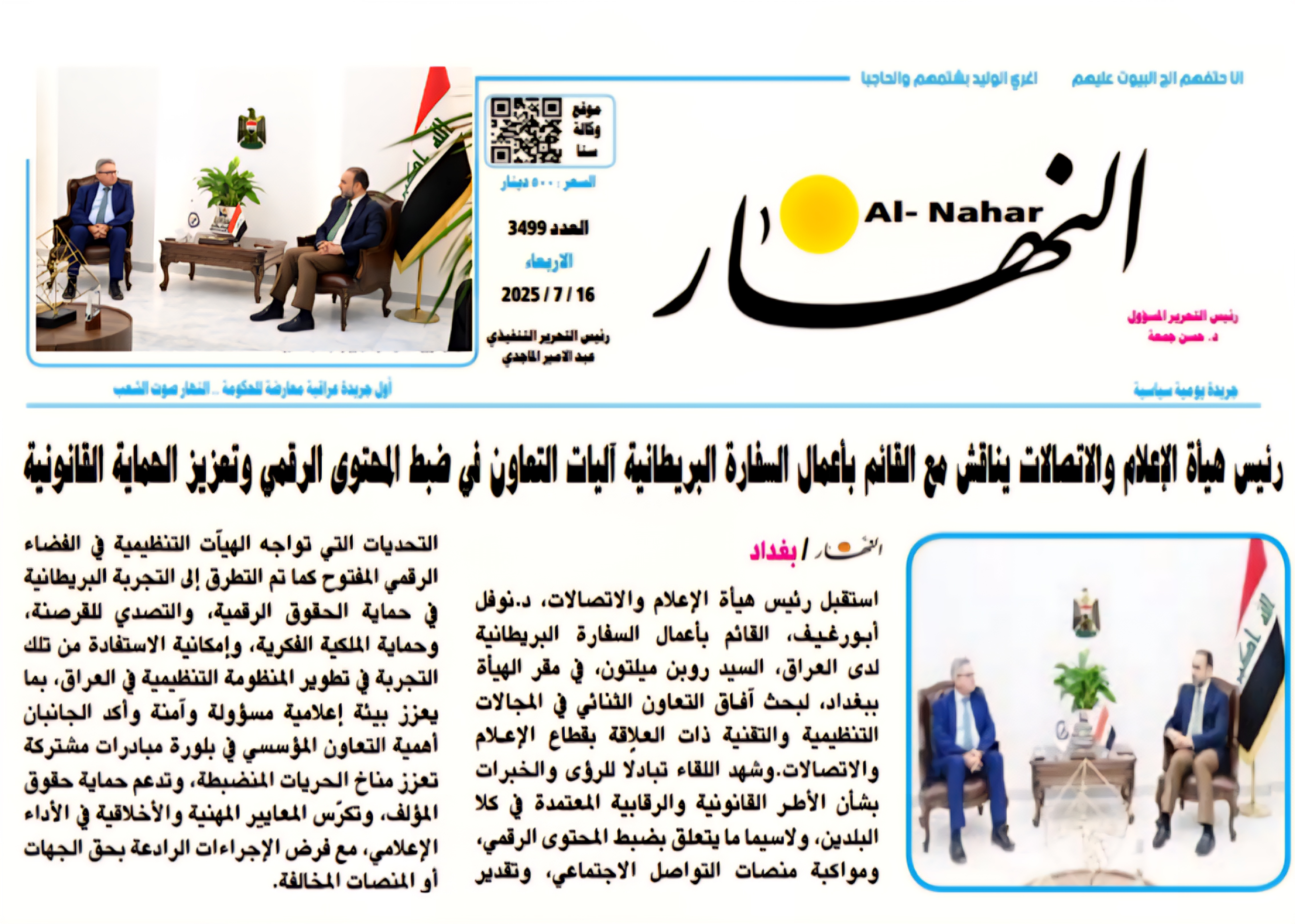صحيفة النهار..رئيس هيأة الاعلام والاتصالات يناقش مع القائم بأعمال السفارة البريطانية الية التعاون في ضبط المحتوى الرقمي