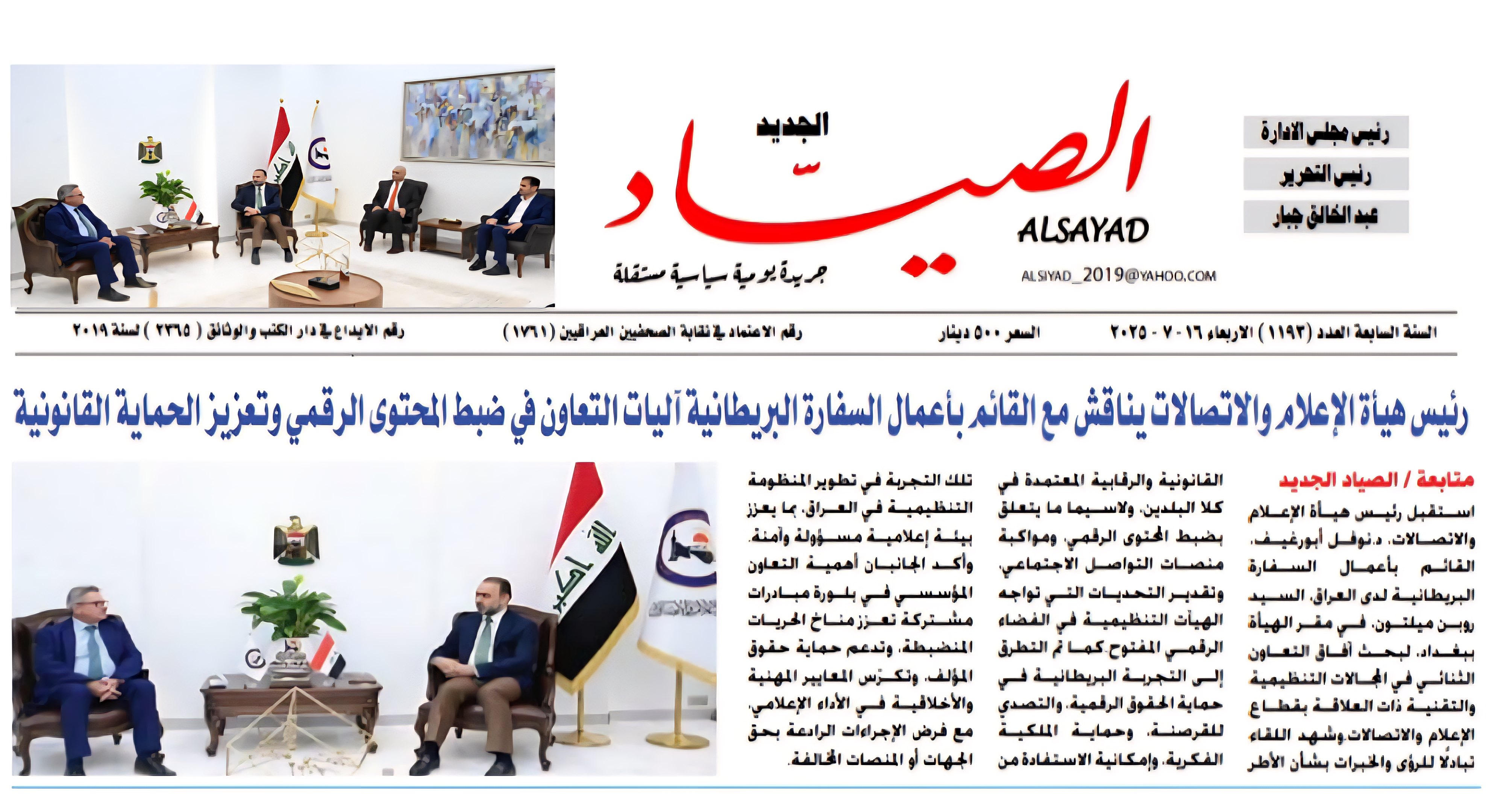 صحيفة الصياد..رئيس هيأة الاعلام والاتصالات يناقش مع القائم بأعمال السفارة البريطانية الية التعاون في ضبط المحتوى الرقمي