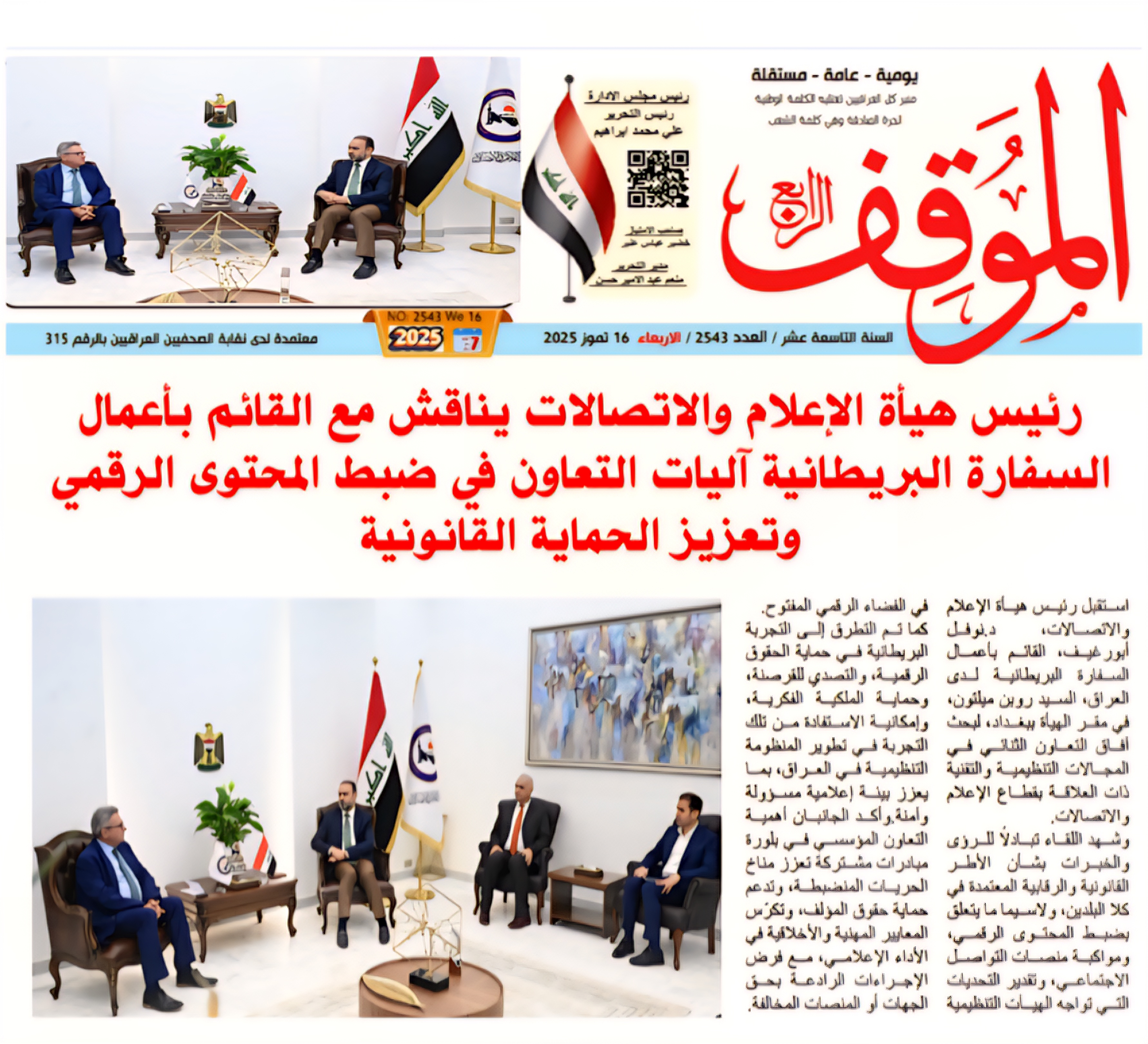 صحيفة الموقف .. رئيس هيأة الاعلام والاتصالات يناقش مع القائم بأعمال السفارة البريطانية الية التعاون في ضبط المحتوى الرقمي