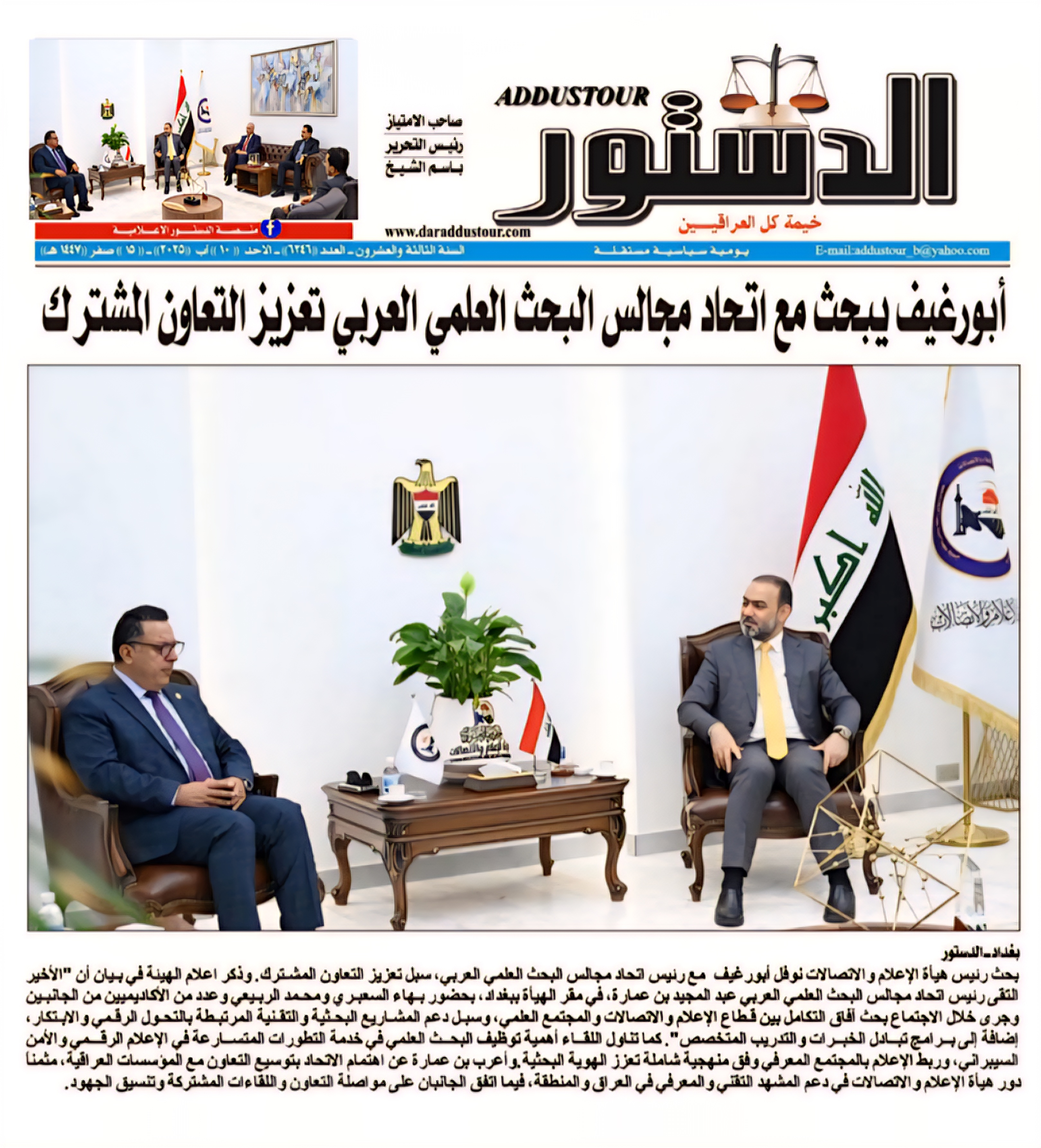 صحيفة الدستور .. ابورغيف يبحث مع اتحاد مجالس البحث العلمي العربي تعزيز التعاون المشترك