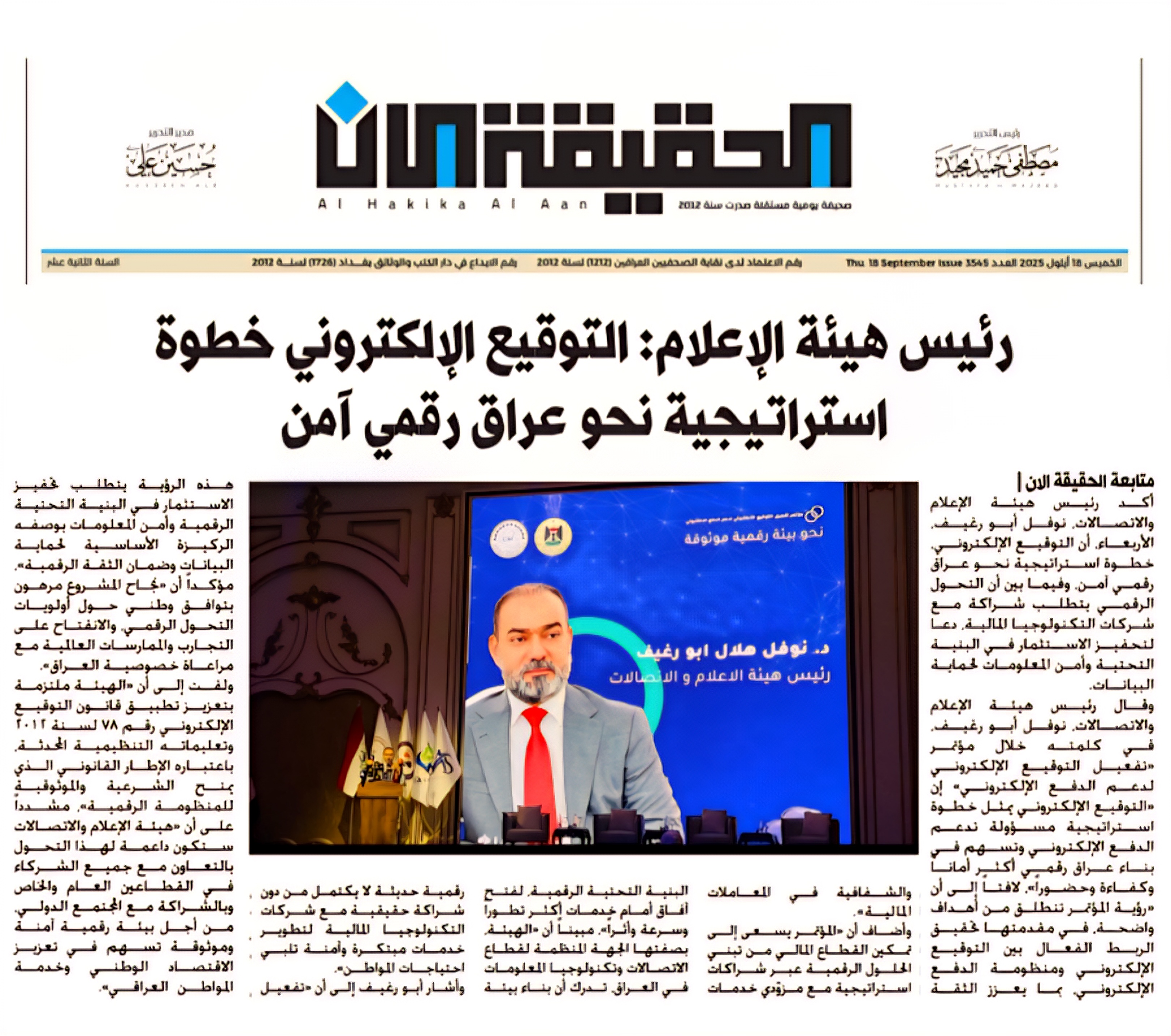 صحيفة الحقيقة الان .. رئيس هيأة الاعلام : التوقيع الالكتروني خطوة استراتيجية نحو عراق رقمي امن