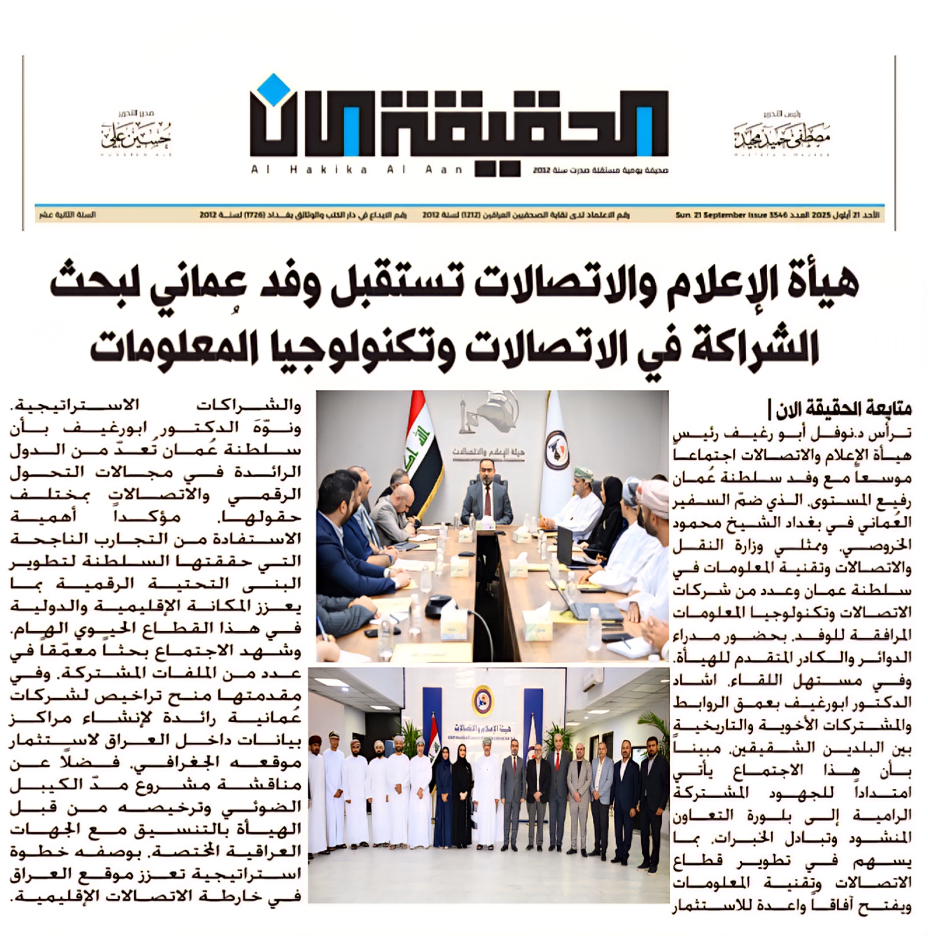 صحيفة الحقيقة الان .. هيأة الاعلام والاتصالات تستقبل الوفد العماني لبحث الشراكة في الاتصالات