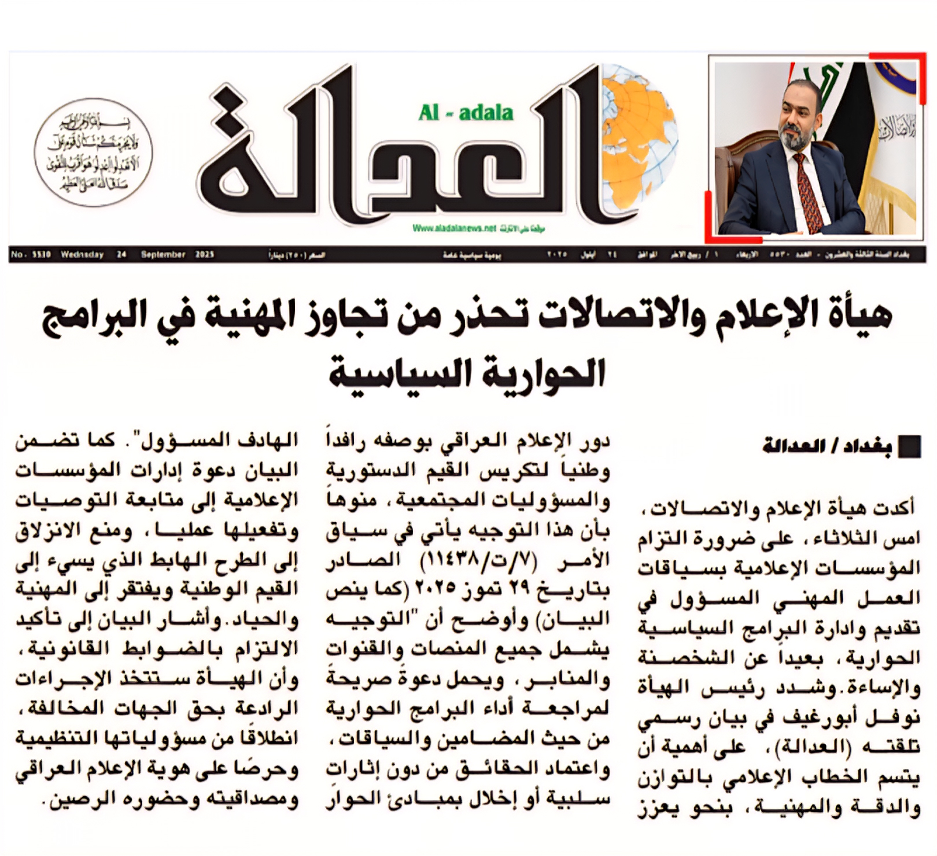 صحيفة العدالة .. هيأة الاعلام والاتصالات تحذر من تجاوز المهنية في البرامج الحوارية السياسية