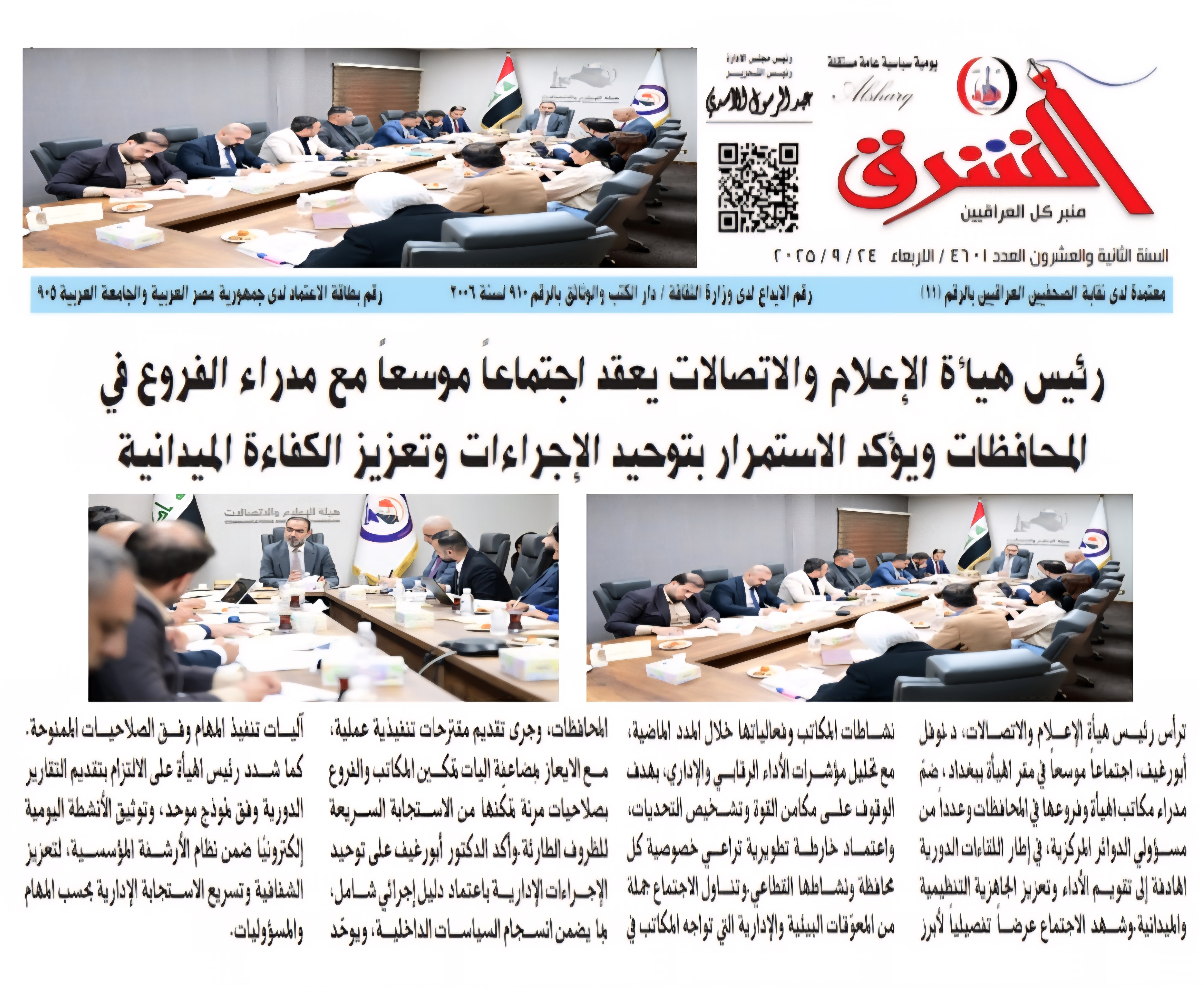 صحيفة الشرق .. رئيس هيأة الاعلام والاتصالات يعقد اجتماع مع مدراء الفروع في المحافظات