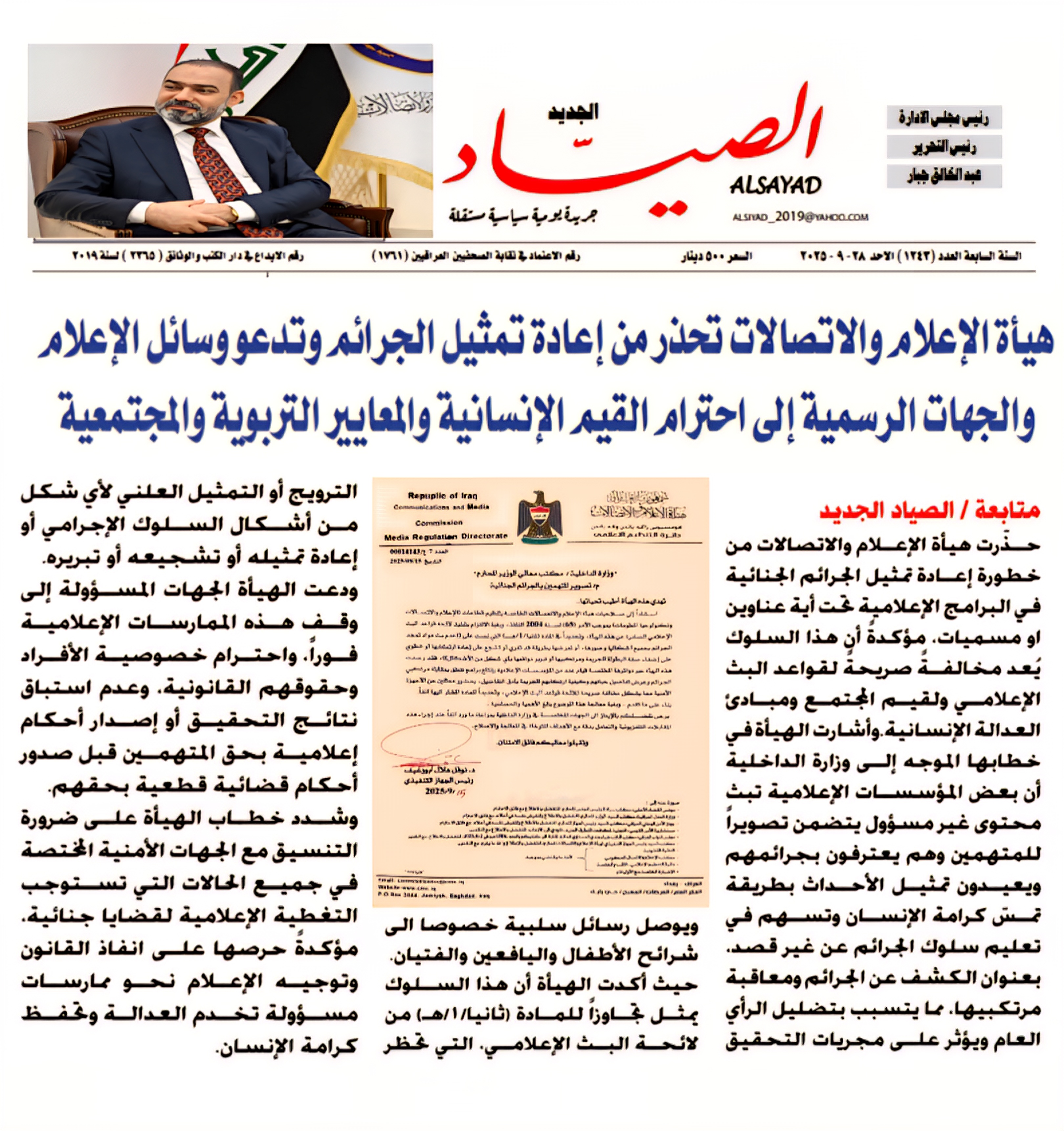 صحيفة الصياد .. هيأة الاعلام والاتصالات تحذر من اعادة تمثيل الجرائم وتدعو وسائل الاعلام الى احترام القيم الانسانية