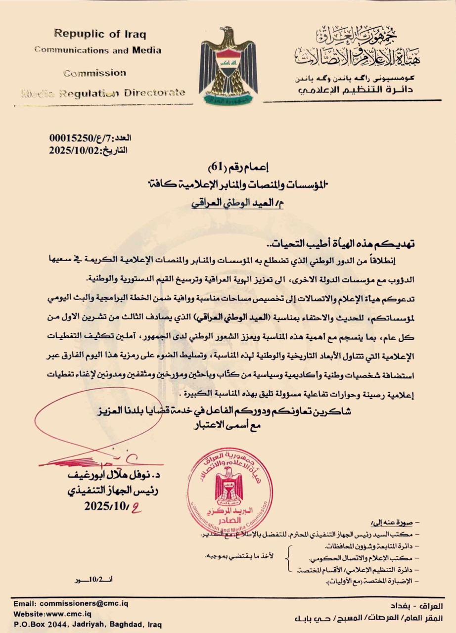 هيأة الإعلام والاتصالات تدعو المؤسسات الإعلامية لتكثيف التغطيات الوطنية والاحتفالية بذكرى العيد الوطني العراقي