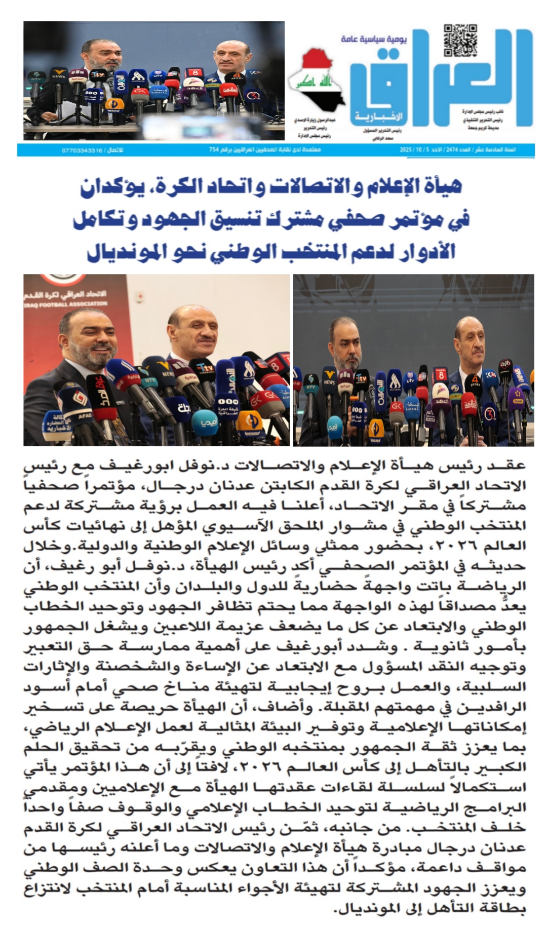 صحيفة العراق الاخبارية .. هيأة الاعلام والاتصالات واتحاد الكرة يؤكدان تنسيق الجهود لدعم المنتخب الوطني