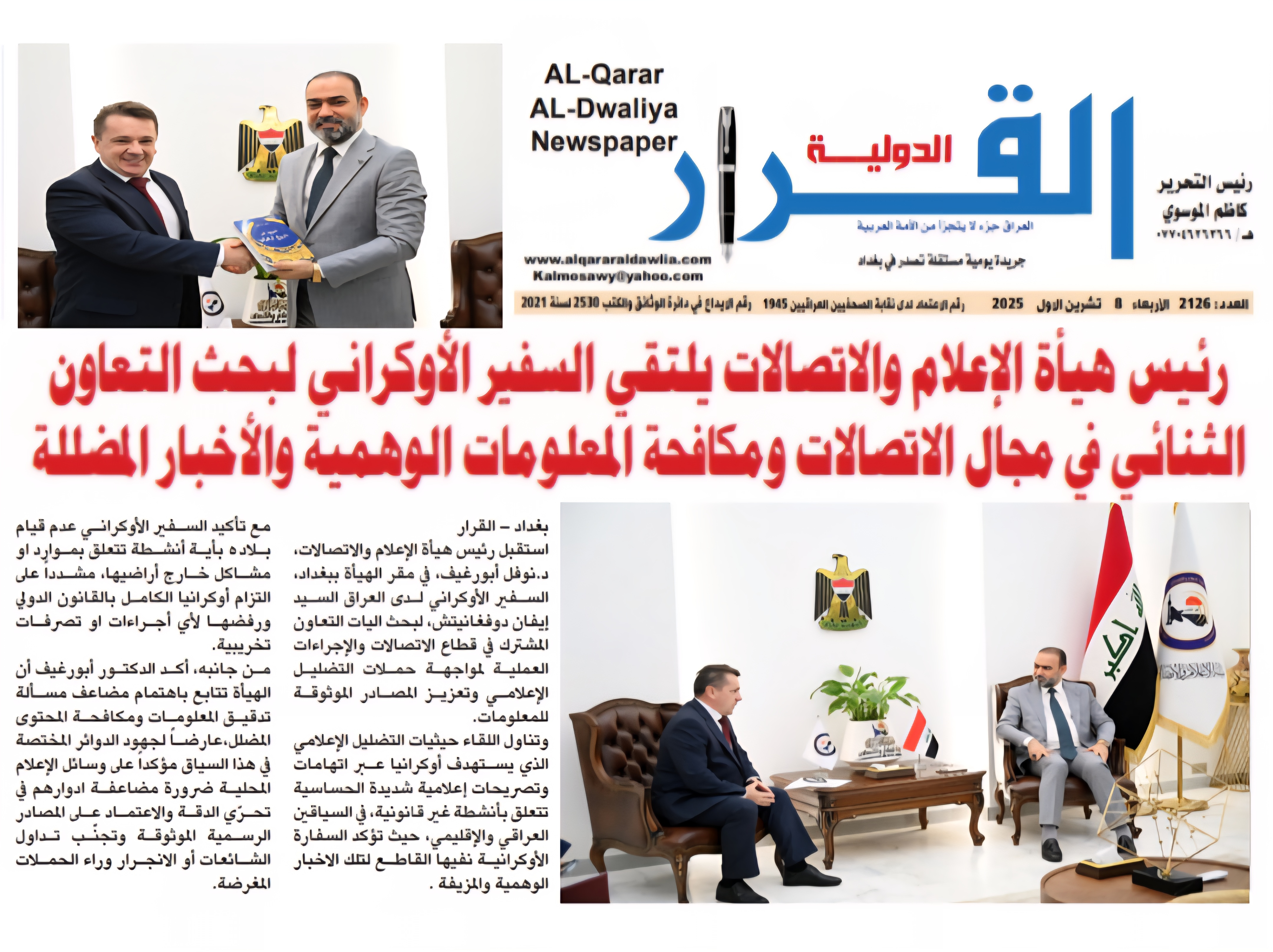 صحيفة القرار الدولية .. رئيس هيأة الاعلام والاتصالات يلتقي السفير الاوكراني لبحث التعاون الثنائي في مجال الاتصالات