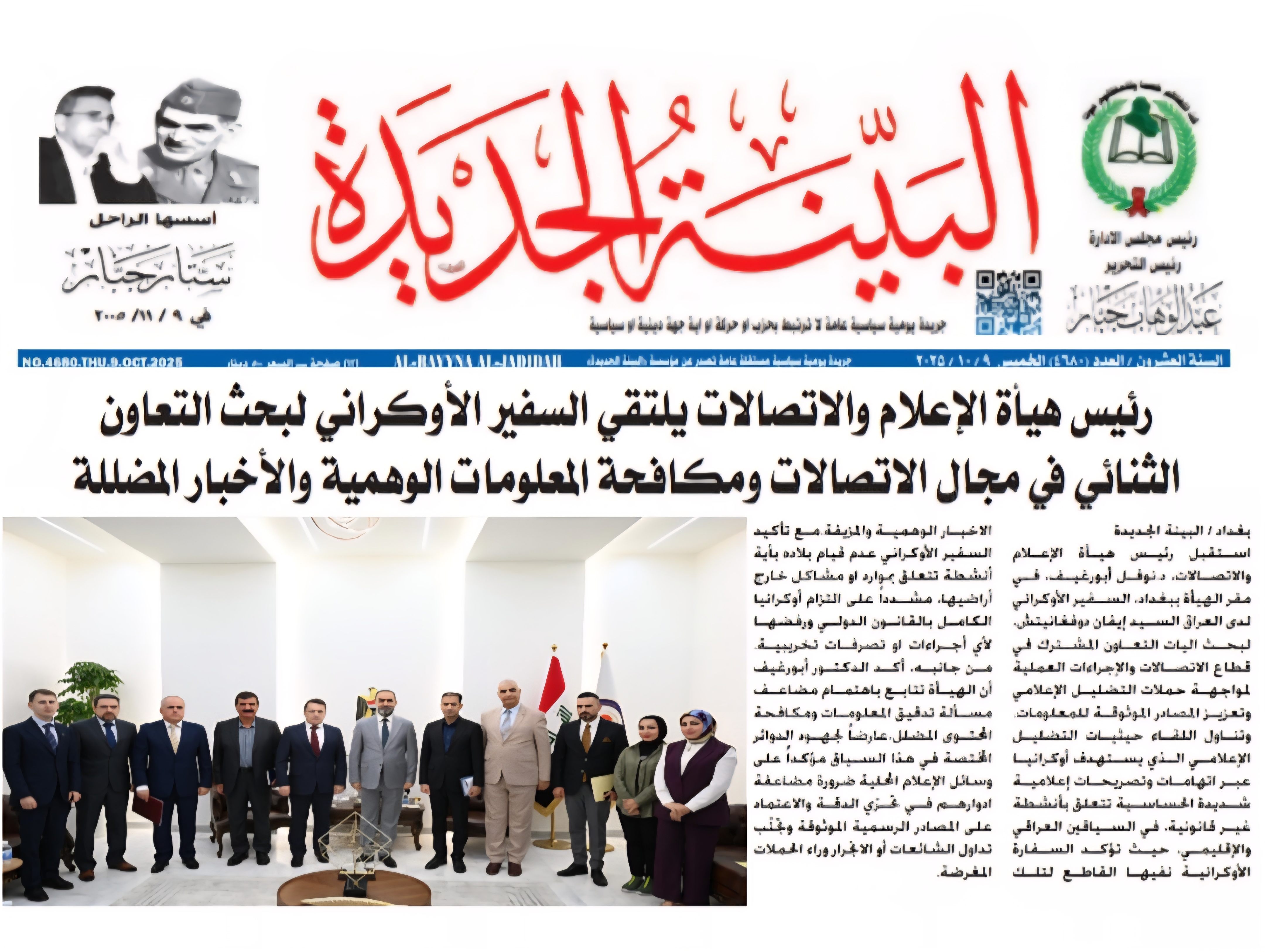 صحيفة البينة الجديدة .. رئيس هيأة الاعلام والاتصالات يلتقي السفير الاوكراني لبحث التعاون الثنائي