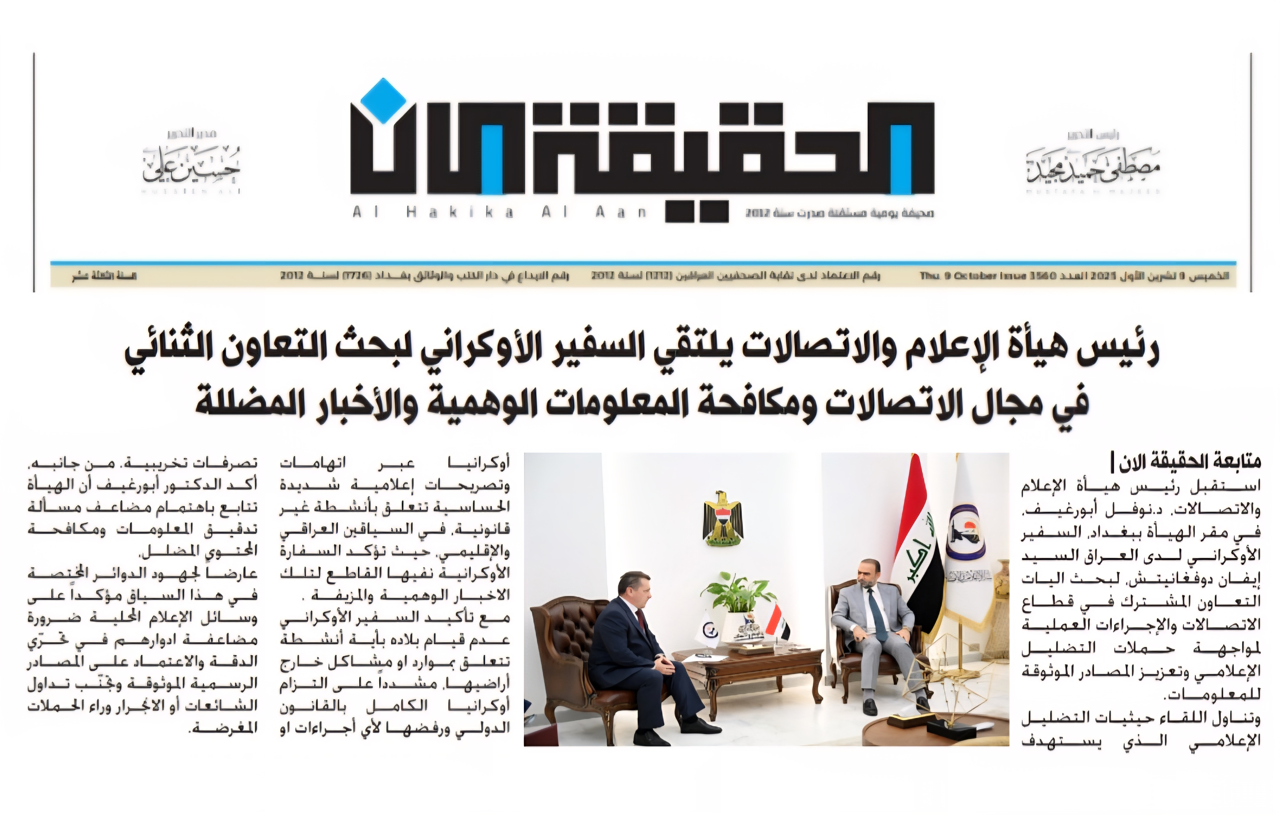 صحيفة الحقيقة الان .. رئيس هيأة الاعلام والاتصالات يلتقي السفير الاوكراني لبحث التعاون الثنائي