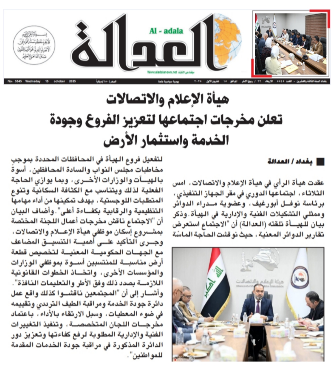 صحيفة العدالة .. هيأة الاعلام والاتصالات تعلن مخرجات اجتماعها لتعزيز الفروع وجودة الخدمة واستثمار الارض