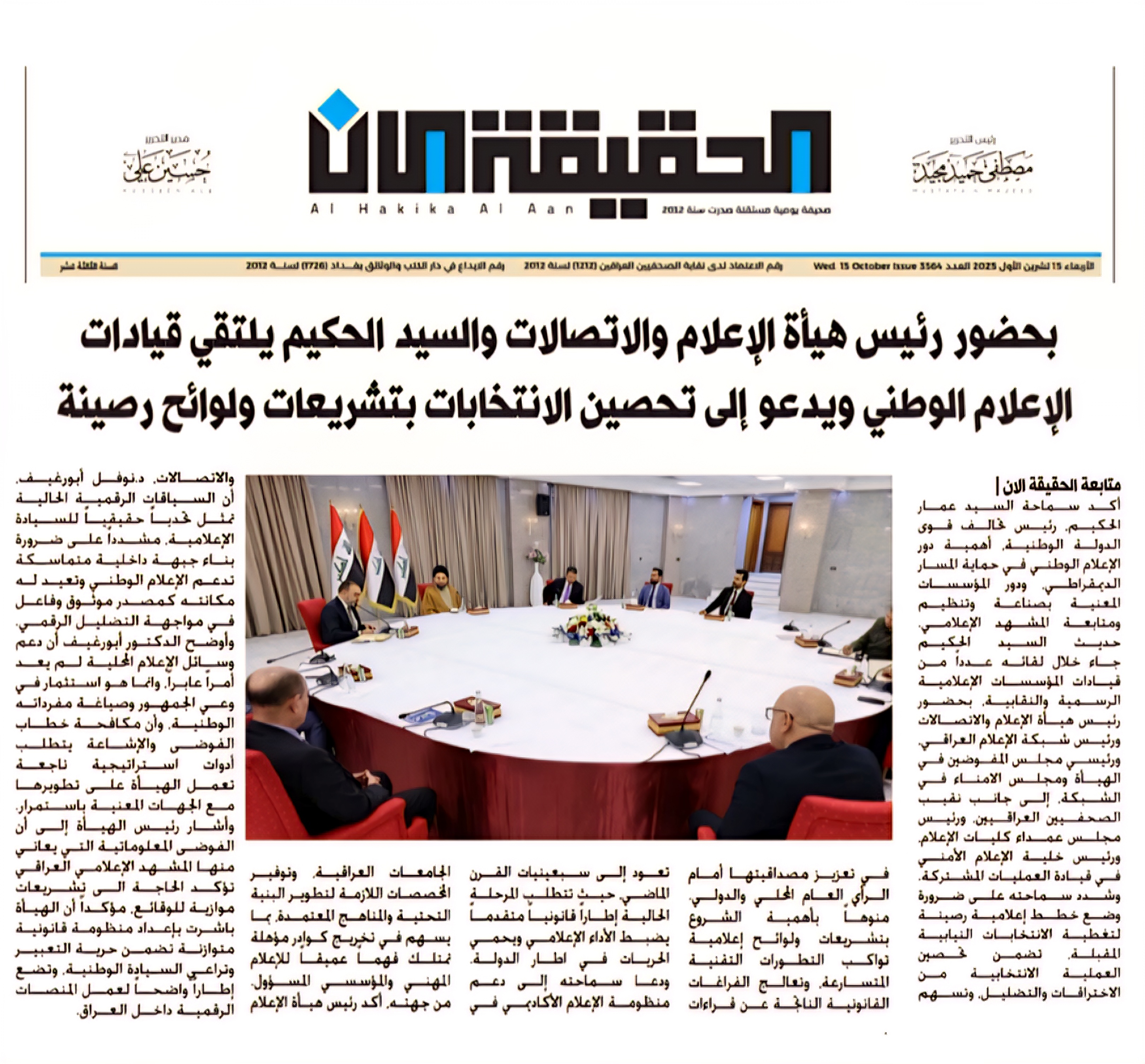 صحيفة الحقيقة الان .. بحضور رئيس هيأة الاعلام والاتصالات السيد الحكيم يلتقي قيادات الاعلام الوطني