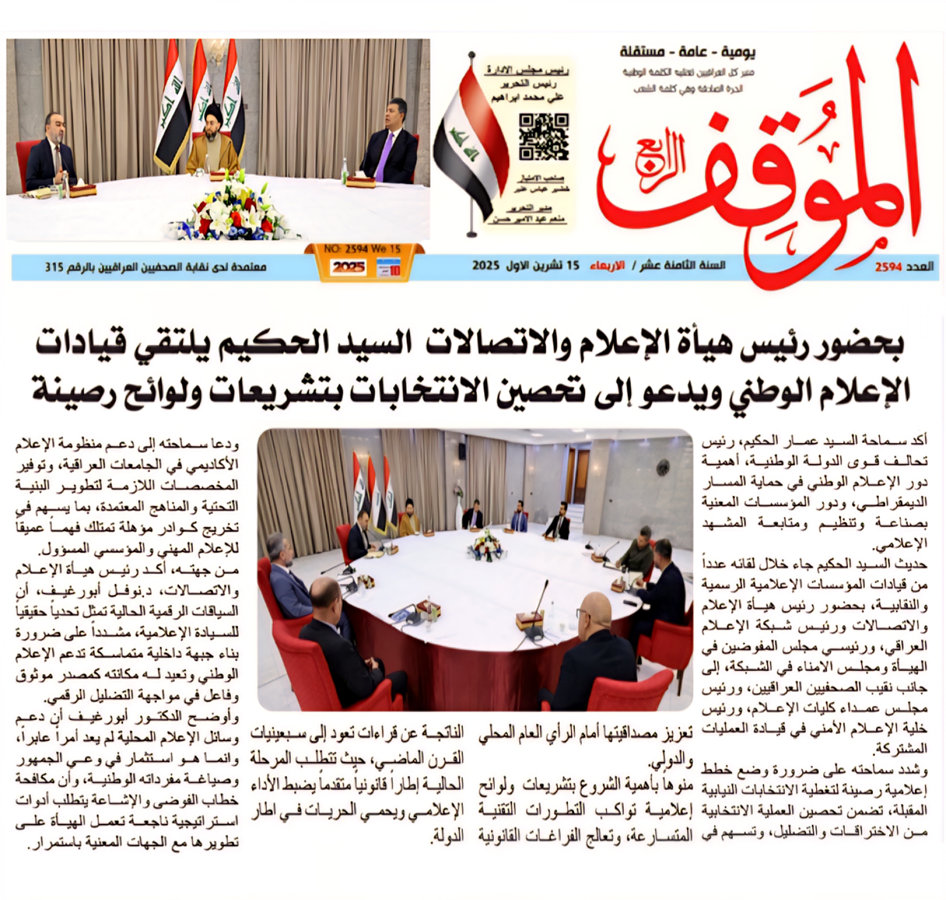 صحيفة الموقف .. بحضور رئيس هيأة الاعلام والاتصالات السيد الحكيم يلتقي قيادات الاعلام الوطني