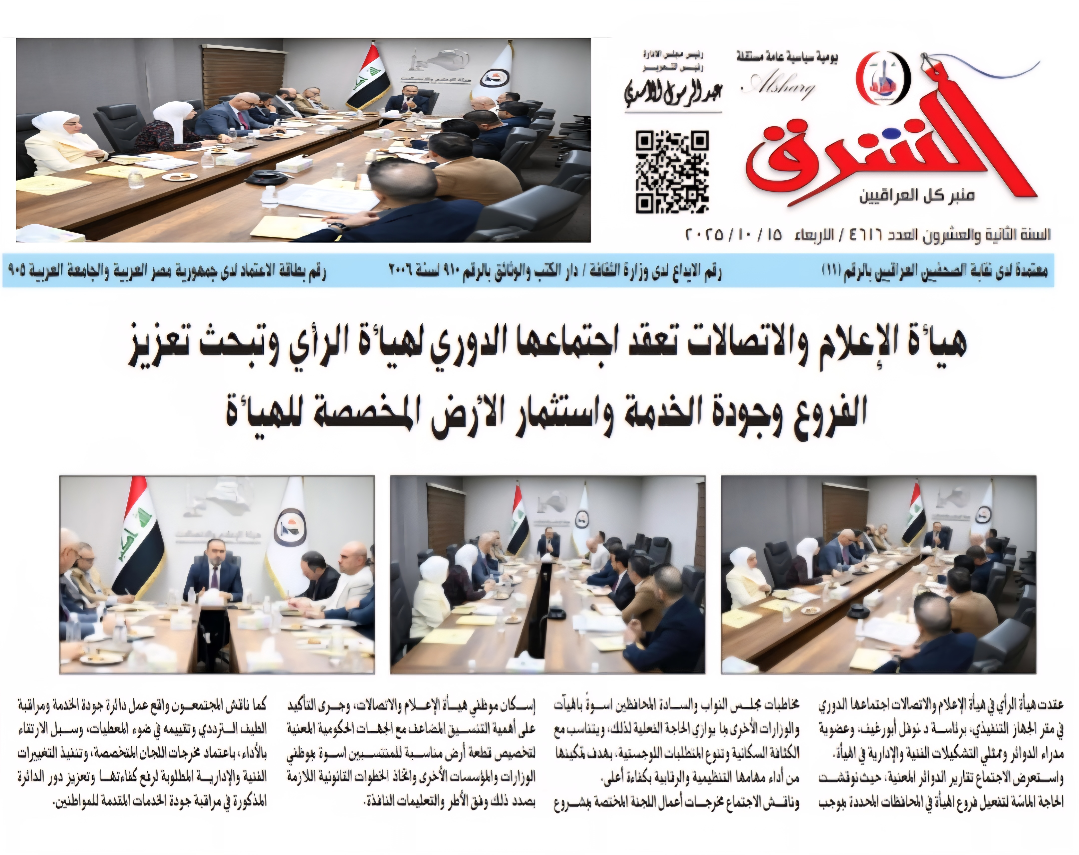 صحيفة الشرق .. هيأة الاعلام والاتصالات تعقد اجتماعها الدوري لهيأة الرأي