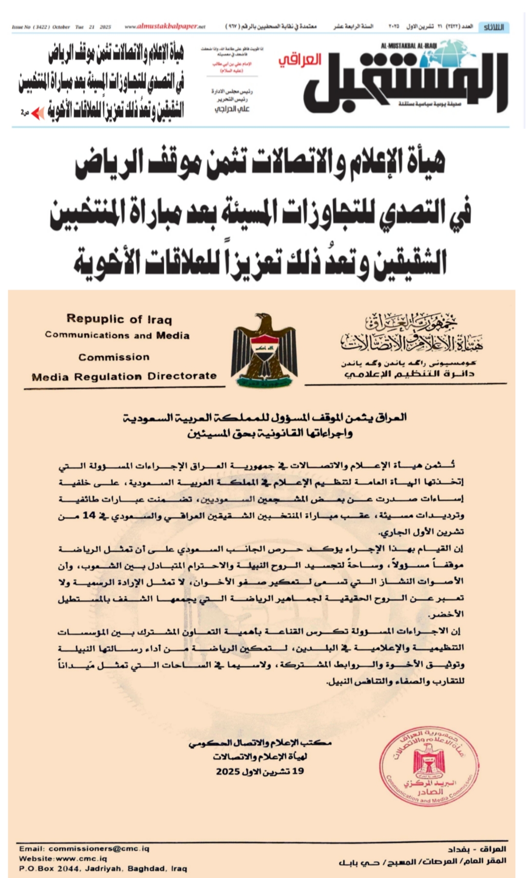 صحيفة المستقبل .. هيأة الاعلام والاتصالات تثمن موقف الرياض في التصدي للتجاوزات المسيئة