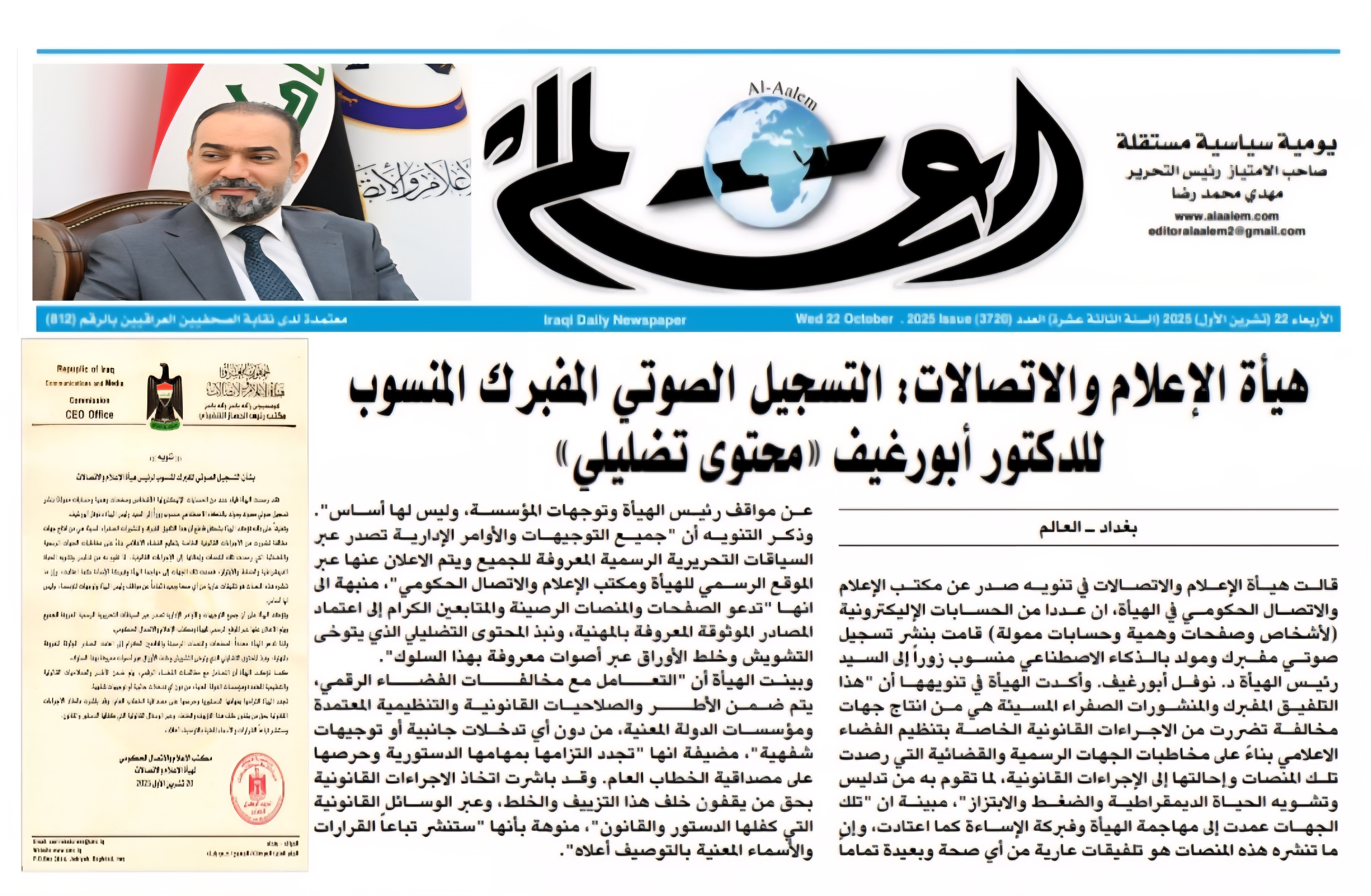 صحيفة المستقبل .. فبركة بالذكاء الاصطناعي .. هيأة الاعلام والاتصالات تكشف تزويرا صوتياً استهدف رئيسها