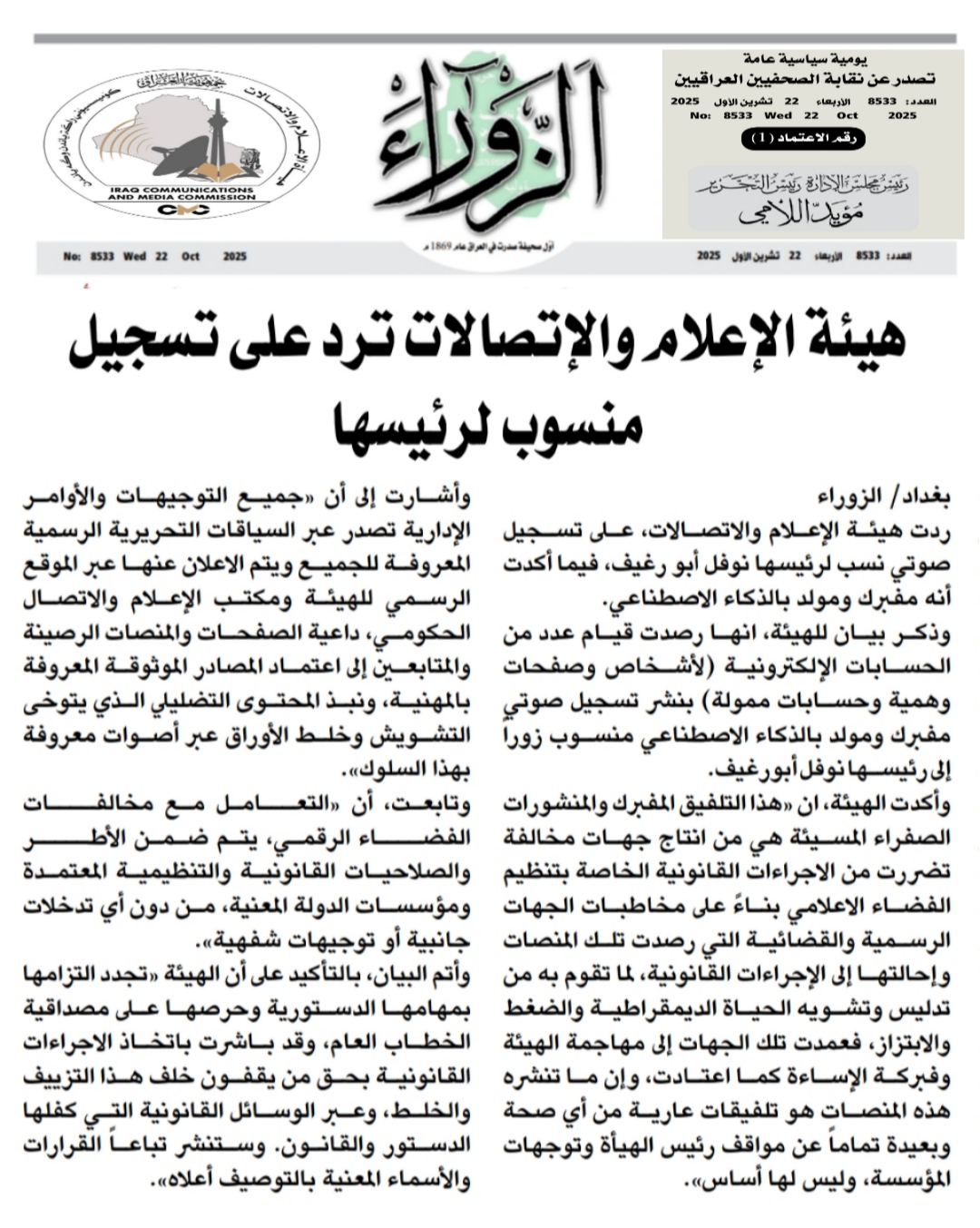 صحيفة المستقبل .. فبركة بالذكاء الاصطناعي .. هيأة الاعلام والاتصالات تكشف تزويرا صوتياً استهدف رئيسها