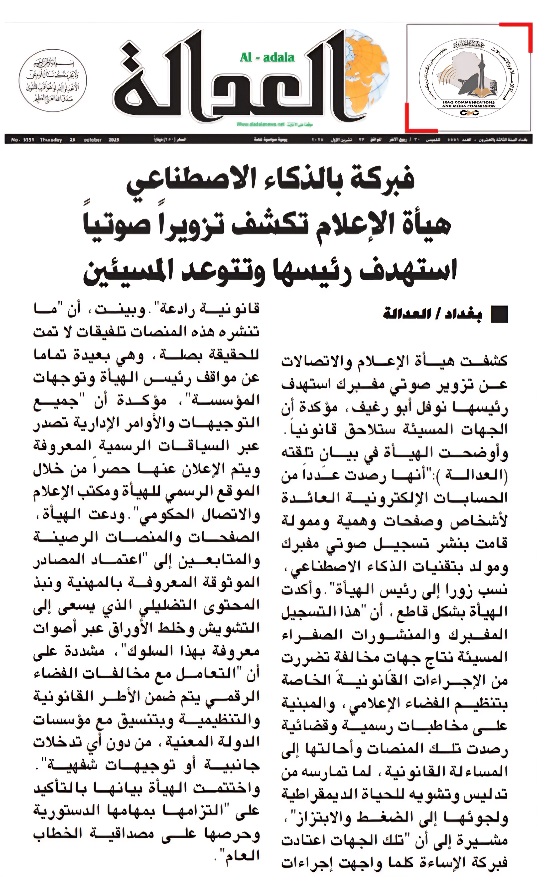 صحيفة العدالة .. هيأة الاعلام والاتصالات تكشف تزويراً صوتياً استهدف رئيسها وتتوعد المسيئين