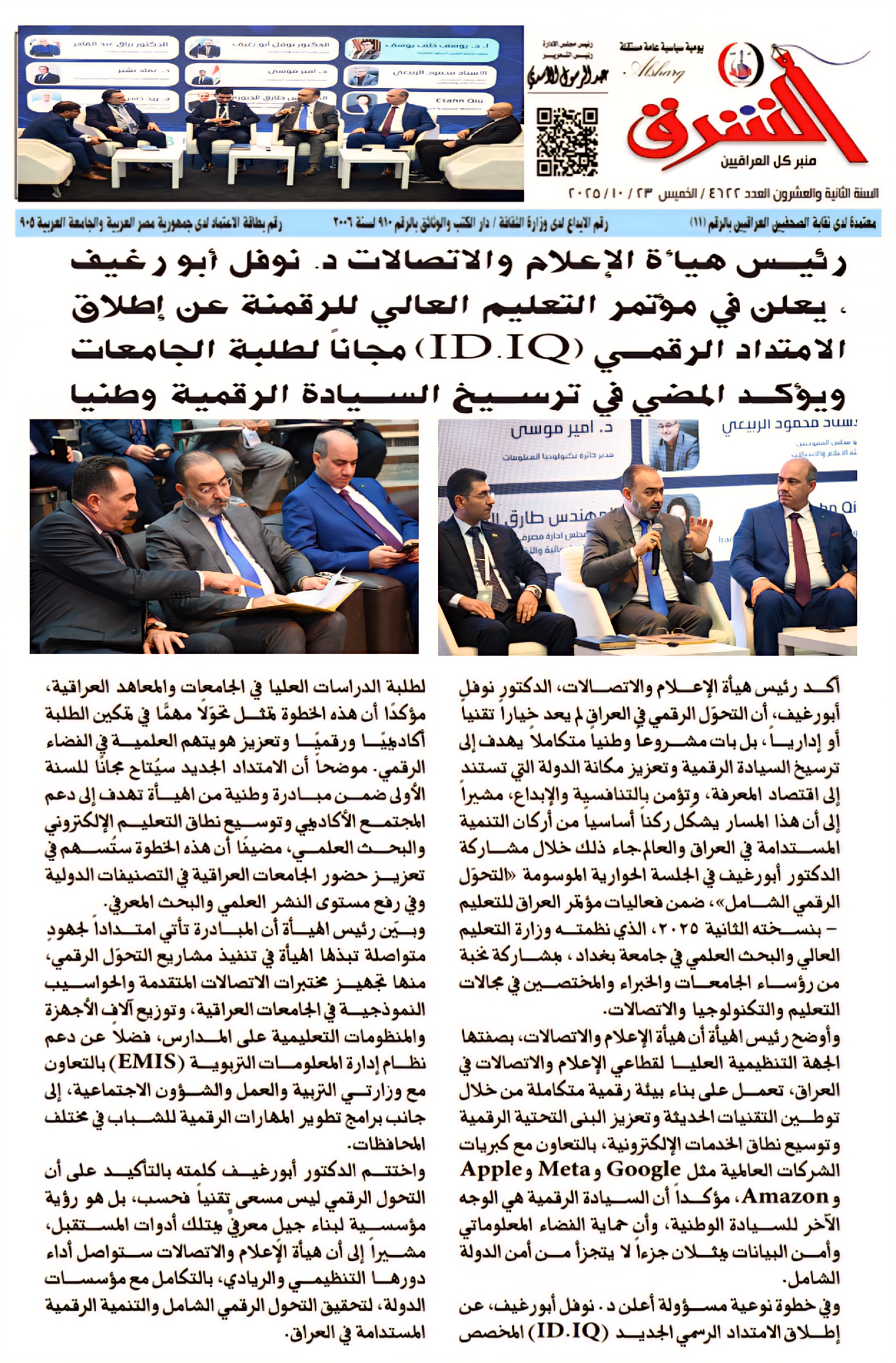 صحيفة المستقبل .. رئيس هيأة الإعلام والاتصالات يعلن في مؤتمر التعليم العالي للرقمنة عن إطلاق الامتداد الرقمي (ID.IQ) مجاناً