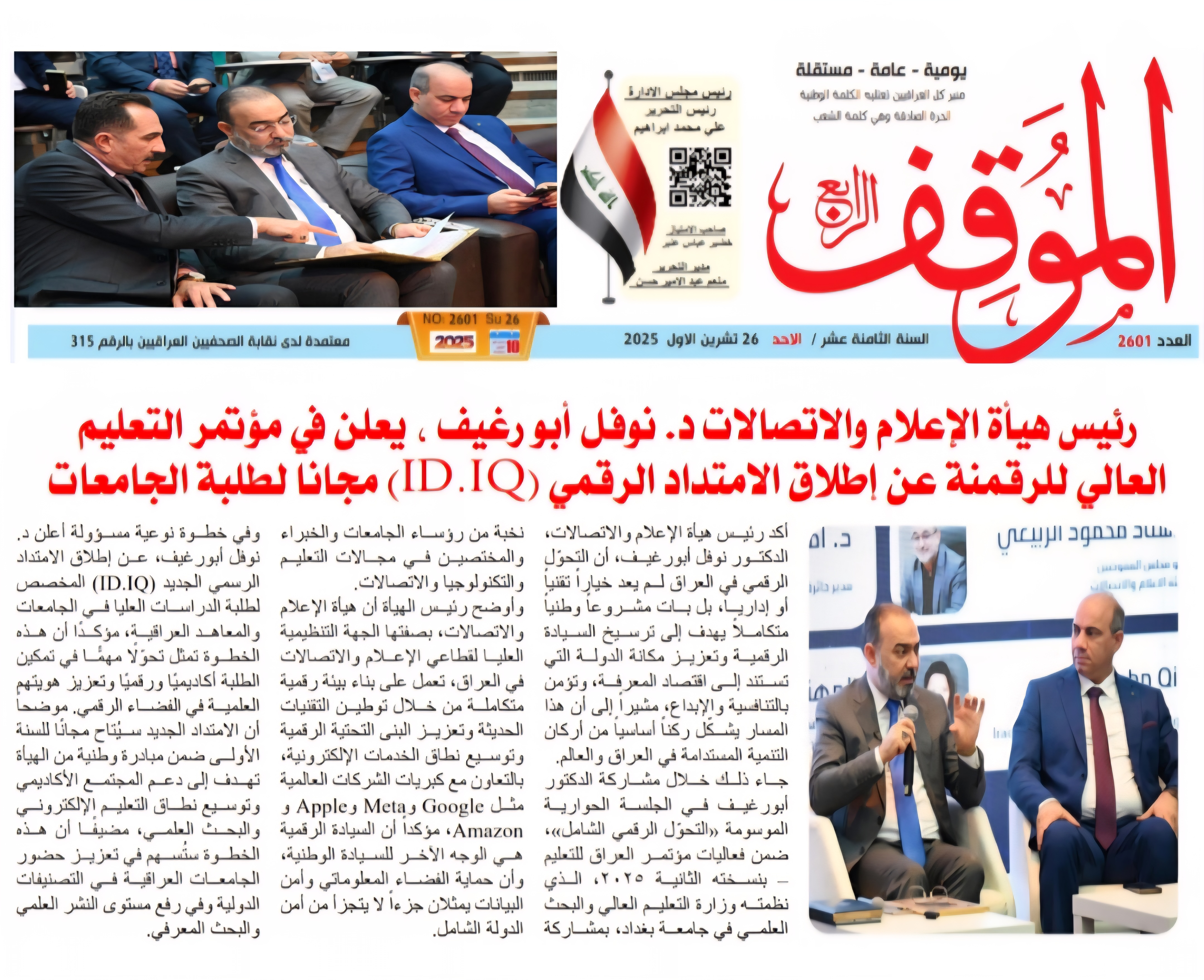 صحيفة الموقف.. رئيس هيأة الاعلام والاتصالات يعلن اطلاق الامتداد الرقمي (ID.IQ) مجانا للطلبة