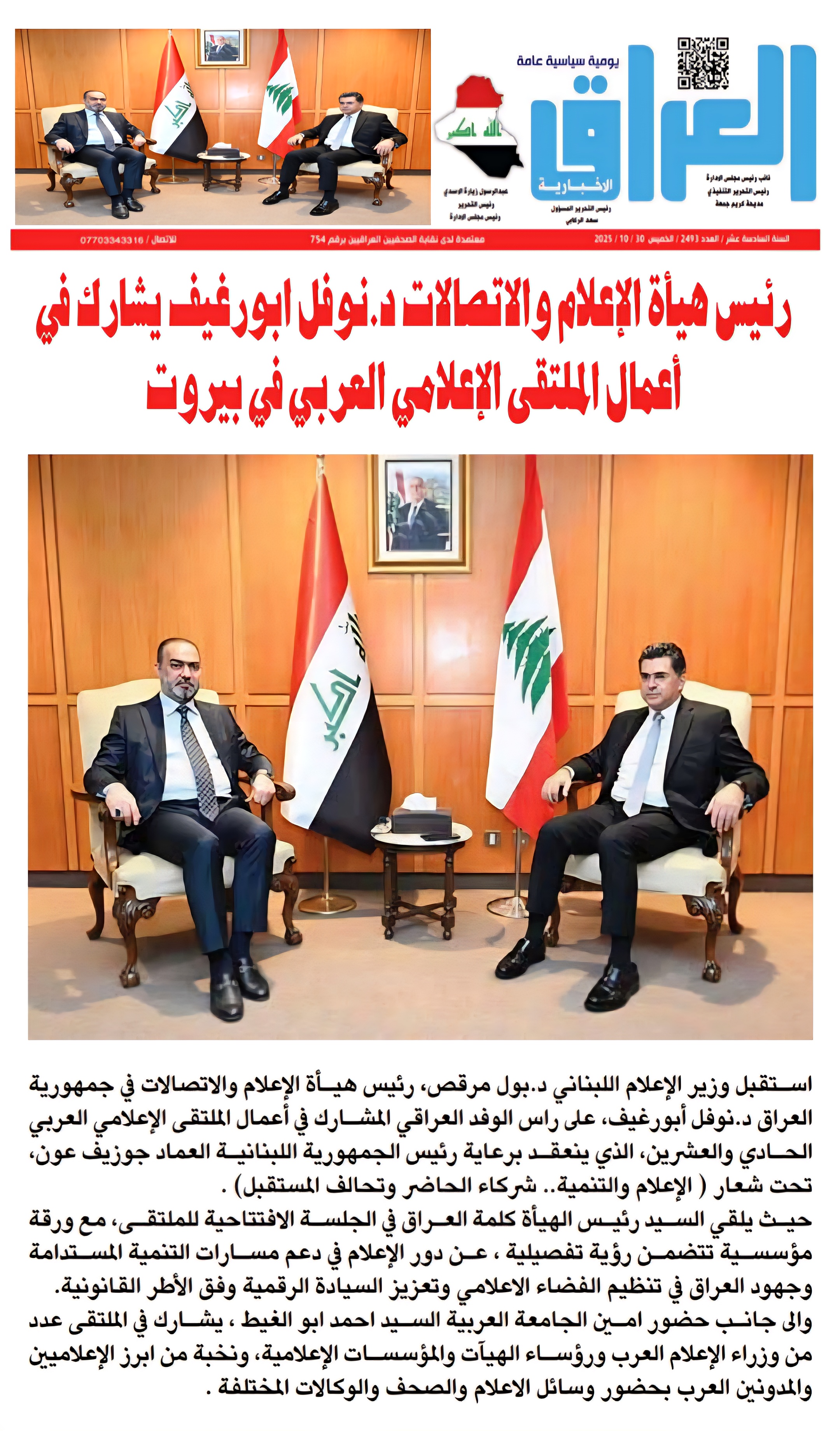 صحيفة العراق الاخبارية.. رئيس هيأة الاعلام والاتصالات يشارك في اعمال الملتقى الاعلامي العربي في بيروت