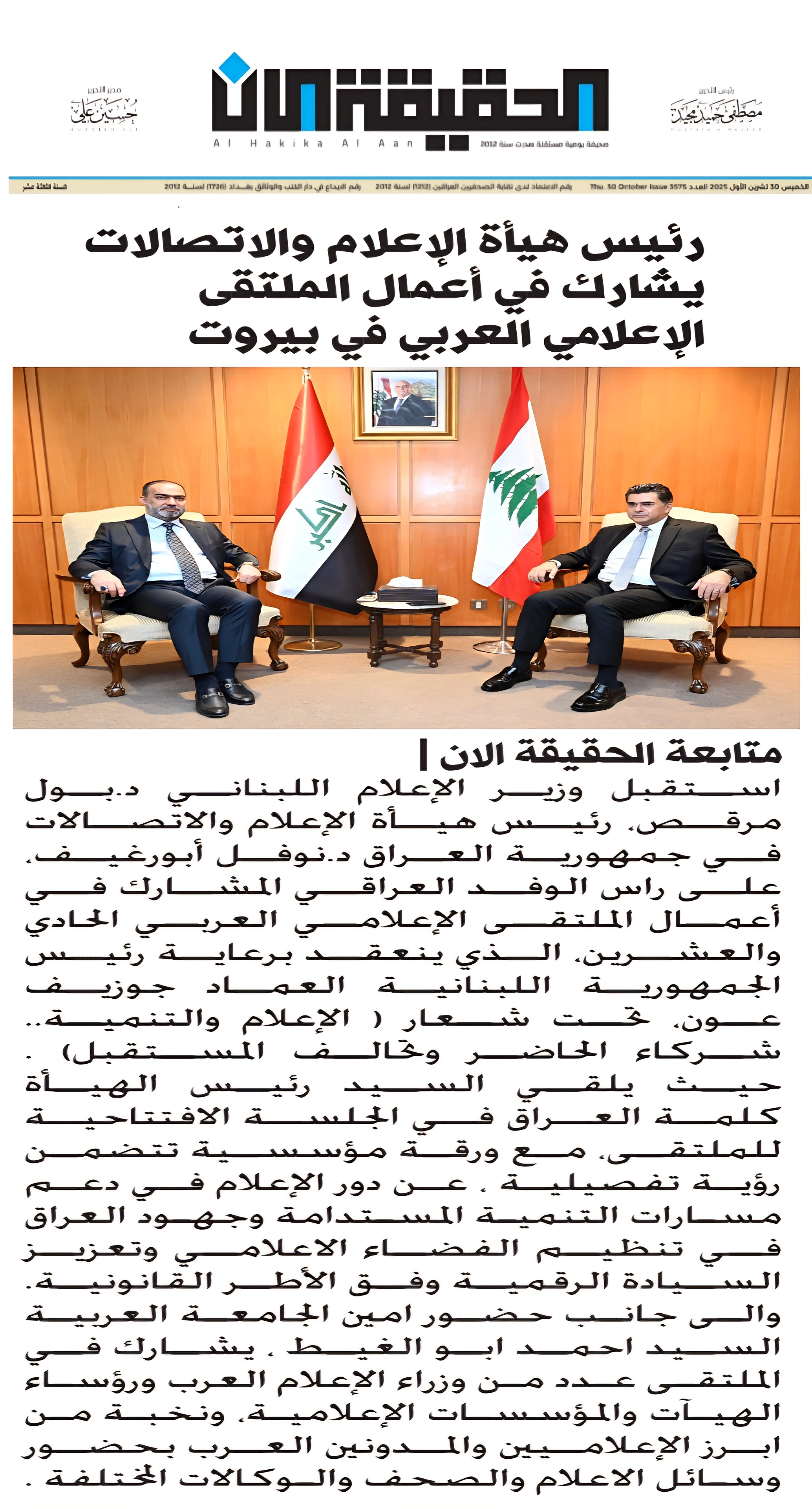 صحيفة الحقيقة الان .. رئيس هيأة الاعلام والاتصالات يشارك في اعمال الملتقى الاعلامي العربي في بيروت