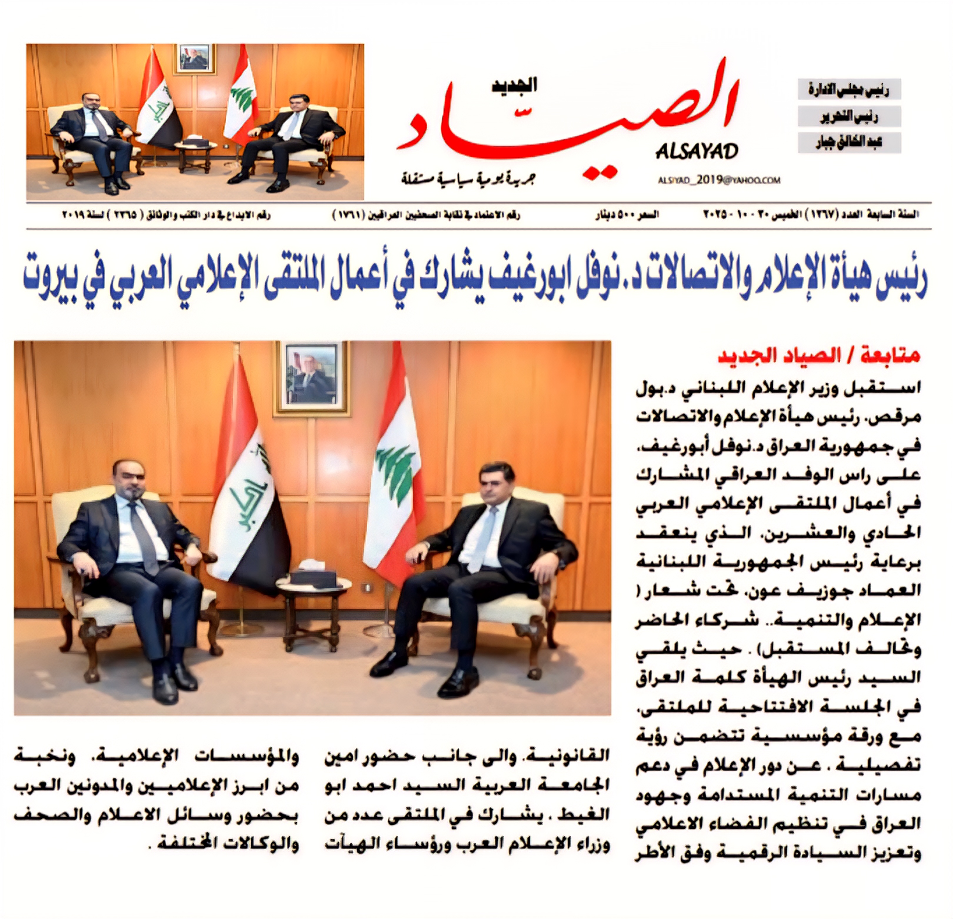صحيفة الصياد..رئيس هيأة الاعلام والاتصالات يشارك في اعمال الملتقى الاعلامي العربي في بيروت