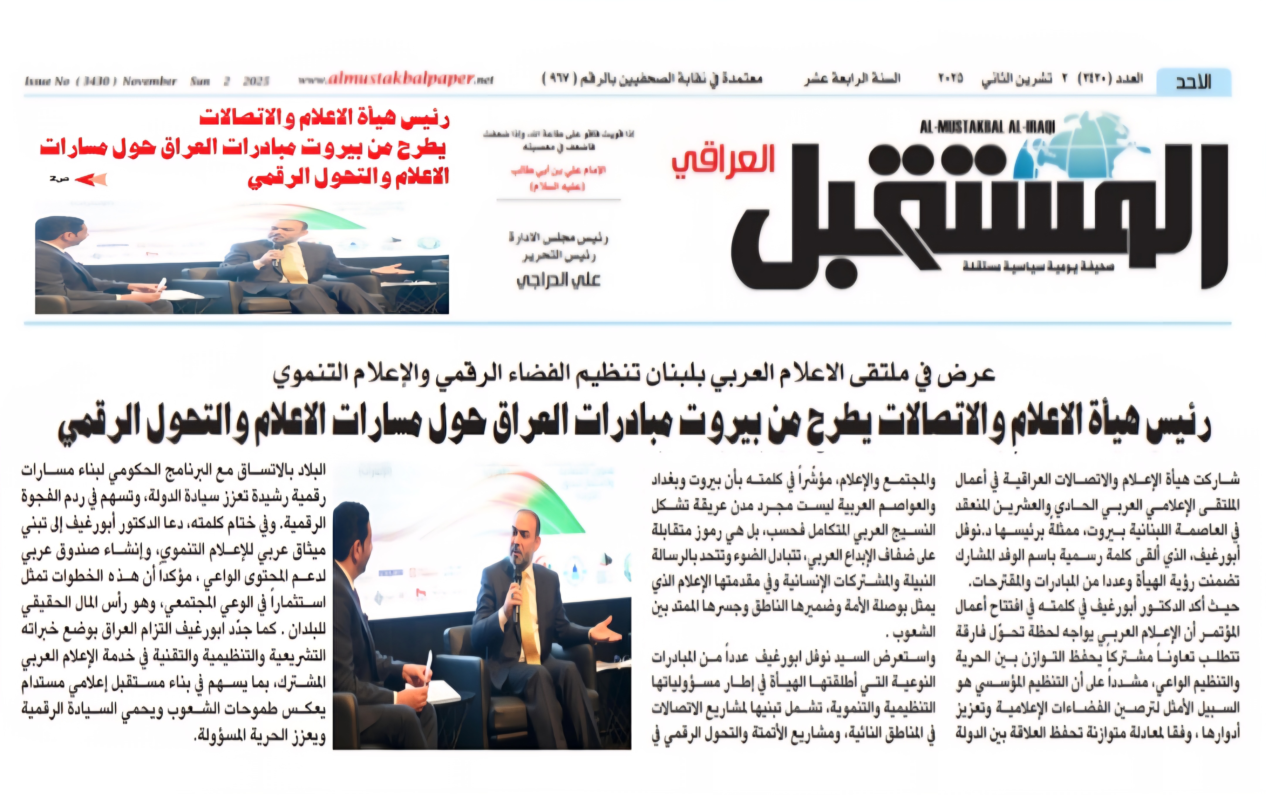 صحيفة المستقبل.. رئيس هيأة الاعلام والاتصالات يطرح من بيروت مبادرات العراق حول مسارات الاعلام والتحول الرقمي