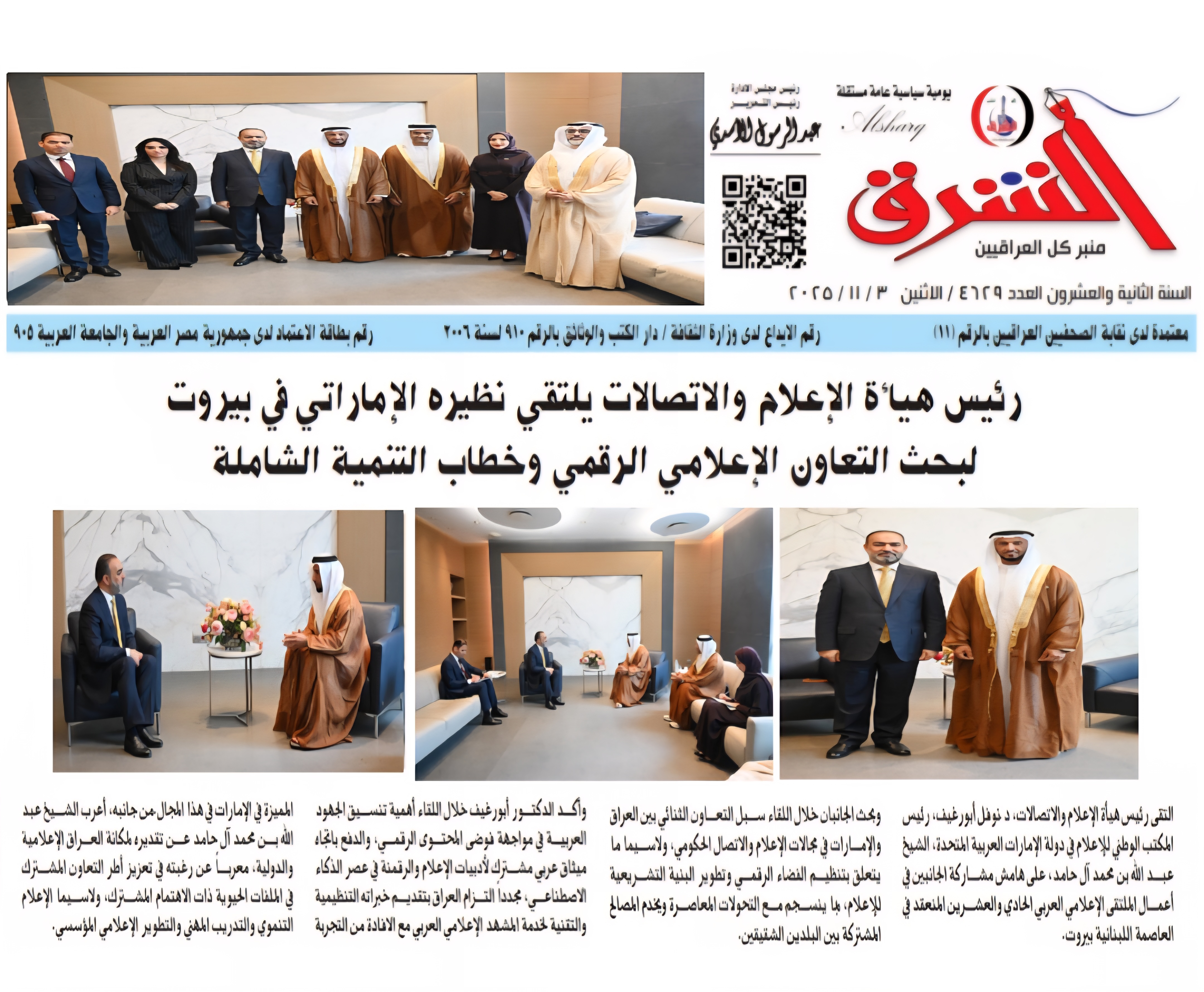 صحيفة الشرق.. رئيس هيأة الاعلام والاتصالات يلتقي نظيره الاماراتي في بيروت لبحث التعاون الاعلامي الرقمي