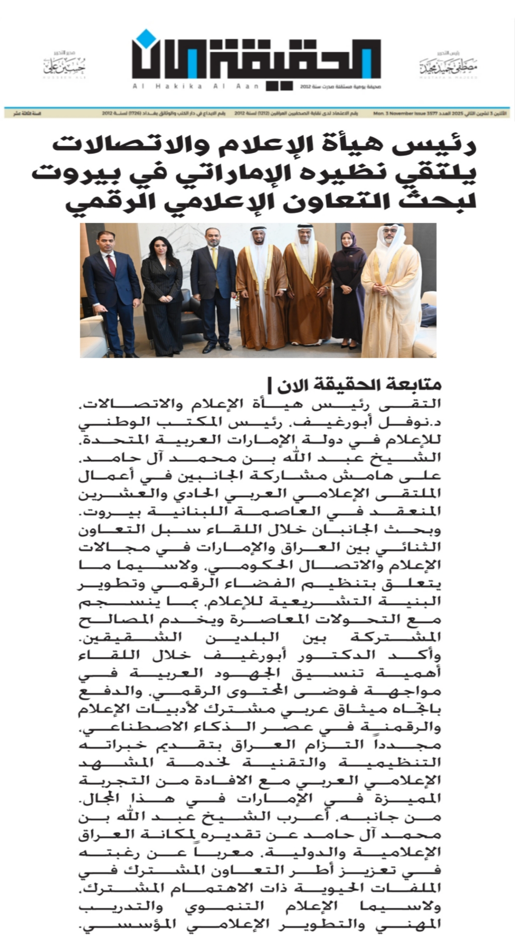 صحيفة الحقيقة الان.. رئيس هيأة الاعلام والاتصالات يلتقي نظيره الاماراتي في بيروت لبحث التعاون الاعلامي الرقمي