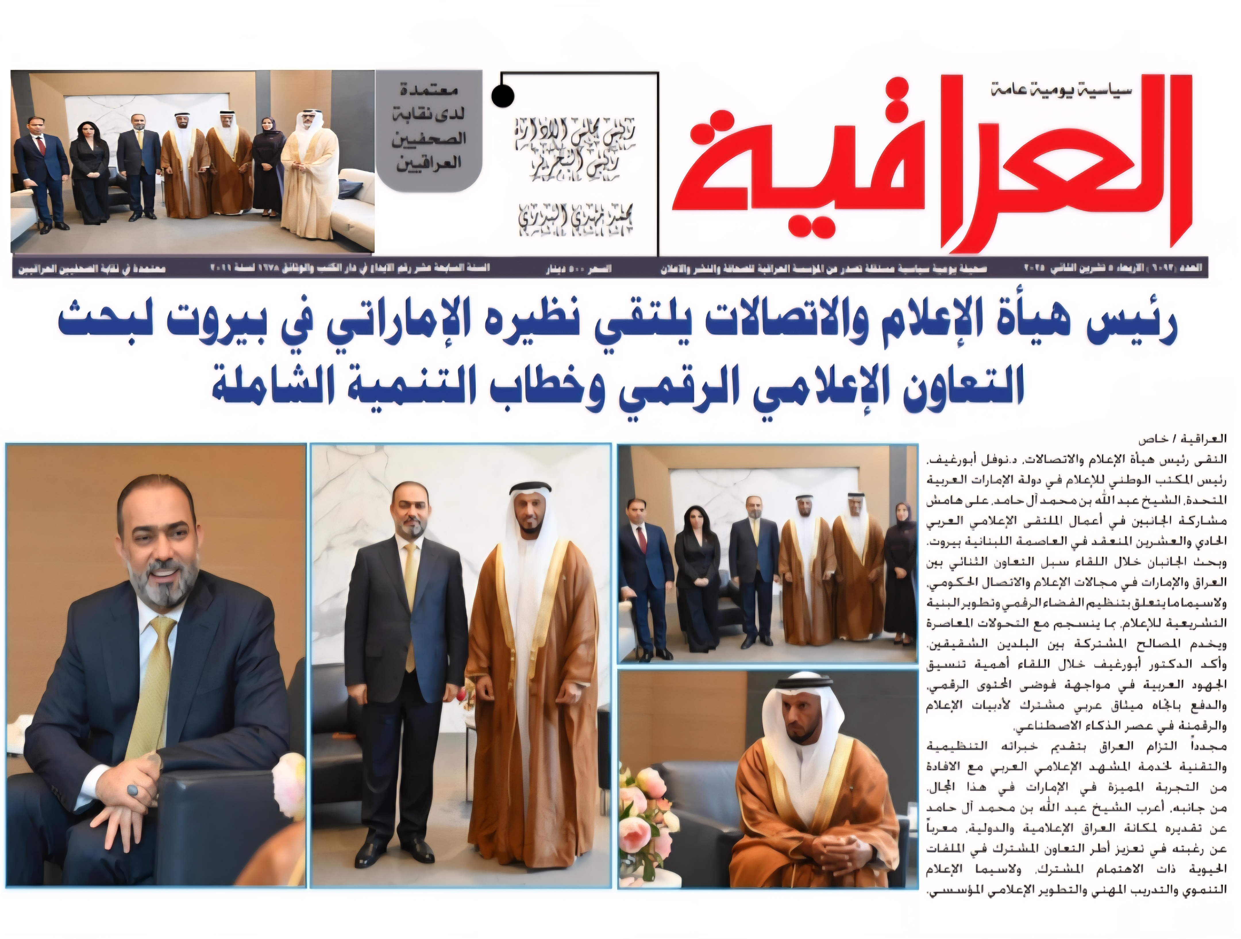 صحيفة العراقية.. رئيس هيأة الإعلام والاتصالات يلتقي نظيره الإماراتي في بيروت لبحث التعاون الإعلامي الرقمي وخطاب التنمية الشاملة