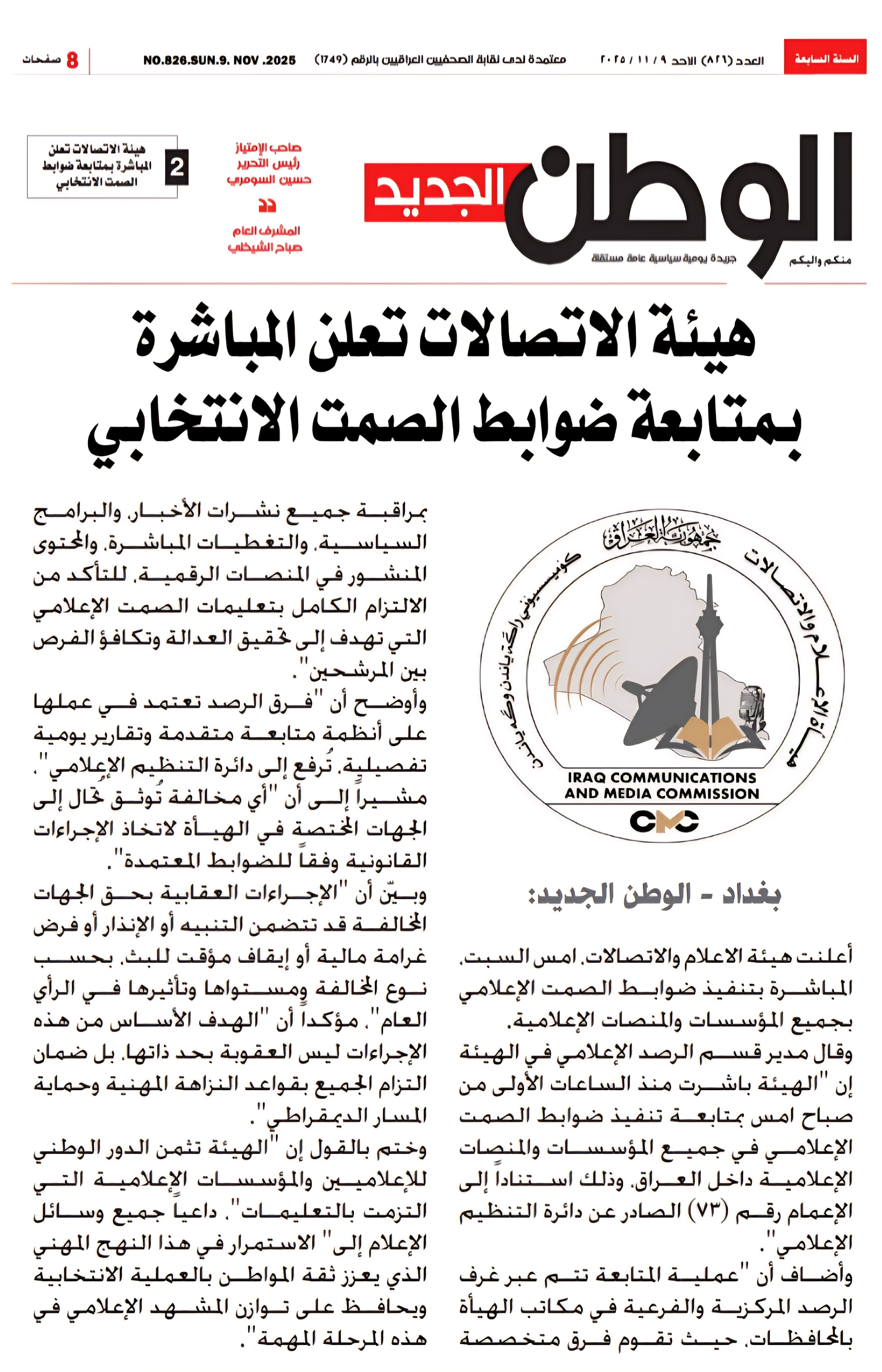 صحيفة الوطن.. هيأة الاعلام والأتصالات تعلن المباشرة بمتابعة ضوابط الصمت الانتخابي