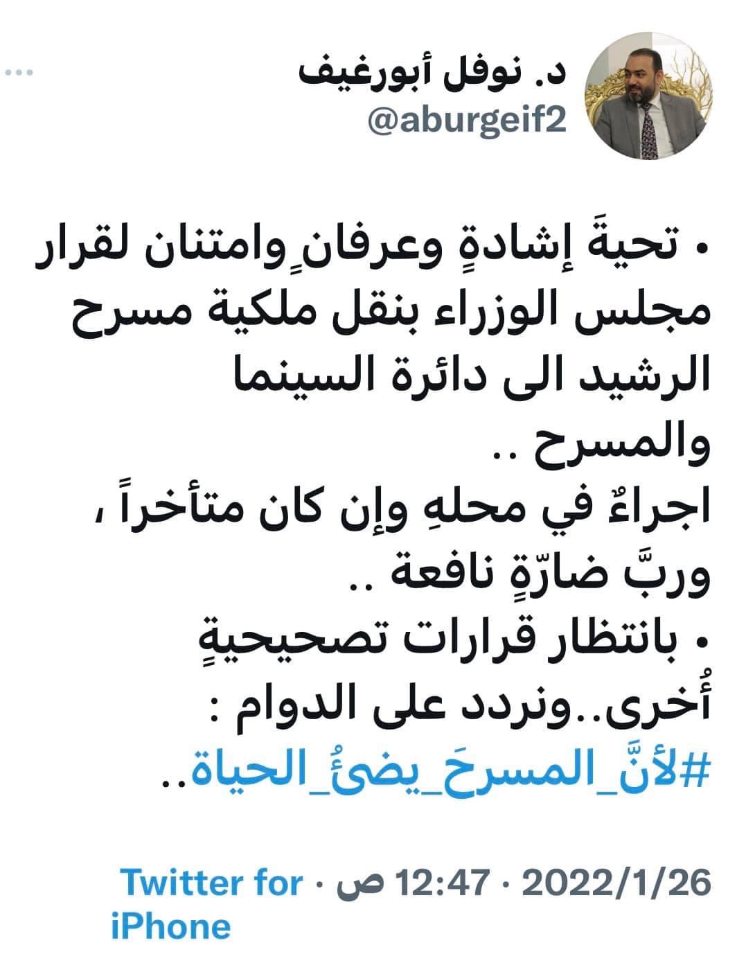 • تحيةَ إشادةٍ وعرفانٍ وامتنان لقرار مجلس الوزراء بنقل ملكية #مسرح_الرشيد الى دائرة السينما والمسرح ..