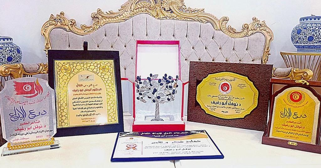 عدد من الجوائز والدروع والشهادات التي قدمتها المؤسسات والجهات الرسمية والثقافية